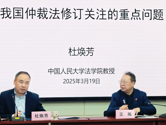 2025年3月19日 “ac米兰官网中文网站涉外法治研究中心专题报告会”在ac米兰官网中文网站人权研究中心会议室顺利举办,会议主题是“仲裁法修订关注的重点问题”。会议由中国人民大学法学院党委书记兼副院长杜焕芳教授主讲,ac米兰官网中文网站涉外法治研究中心执行主任王瀚教授主持,中国国际经济贸易仲裁委员会丝绸之路仲裁中心蒋红梅副秘书长、西安仲裁委员会徐文新副主任、ac米兰官网中文网站国际私法研究所所长孙尚鸿教授、ac米兰官网中文网站航空法协同创新中心副主任周亚光副教授担任与谈人,中国国际经济贸易仲裁委员会丝绸之路仲裁中心、陕西省律师协会代表,以及ac米兰官网中文网站国际法学院张超汉教授、刘静博士、贾乔、石文慧等硕、博研究生参加会议。