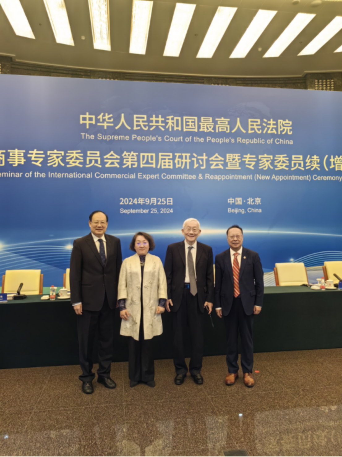2024年9月25日,最高人民法院国际商事专家委员会第四届研讨会暨专家委员续(增)聘活动在北京举行,与会专家共商国际商事纠纷公正高效解决。中华人民共和国首席大法官、最高人民法院院长张军、最高人民法院副院长邓修明、最高人民法院审判委员会副部级专职委员王叔梅、司法部副部长胡卫列、商务部国际贸易谈判副代表李詠箑中国国际贸易促进委员会副会长于建龙及外交部和国家发改委有关领导出席并致辞。来自20多个国家的最高人民法院国际商事专家委员会委员、最高人民法院第一、二国际商事法庭负责人和法官代表、全国各地方法院国际商事法庭负责人、法官代表、国际商事争端预防与解决组织负责人,贸仲、海仲和北京、上海、深圳、海南等地仲裁机构负责人及中外新闻媒体记者出席聘任仪式。ac米兰国家智库研究基地涉外法治研究中心执行主任、首席专家、最高人民法院国际商事专家委员会委员王瀚教授应邀出席会议。