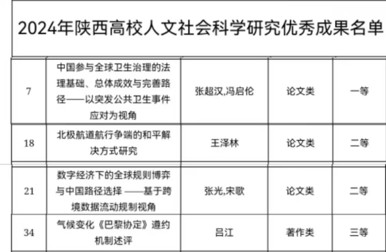 近日,陕西省教育厅公布了2024年陕西高校人文社会科学研究优秀成果获奖名单,国际法学院四位教师获奖,涵盖论文、著作等类别。其中,张超汉教授和冯启伦硕士的论文《中国参与全球卫生治理的法理基础、总体成效与完善路径——以突发公共卫生事件应对为视角》获一等奖;张光教授和宋歌硕士的论文《数字经济下的全球规则博弈与中国路径选择——基于跨境数据流动规制视角》获二等奖;王泽林教授的论文《北极航道航行争端的和平解决方式研究》获二等奖;吕江教授的专著《气候变化<巴黎协定>遵约机制述评》获三等奖。