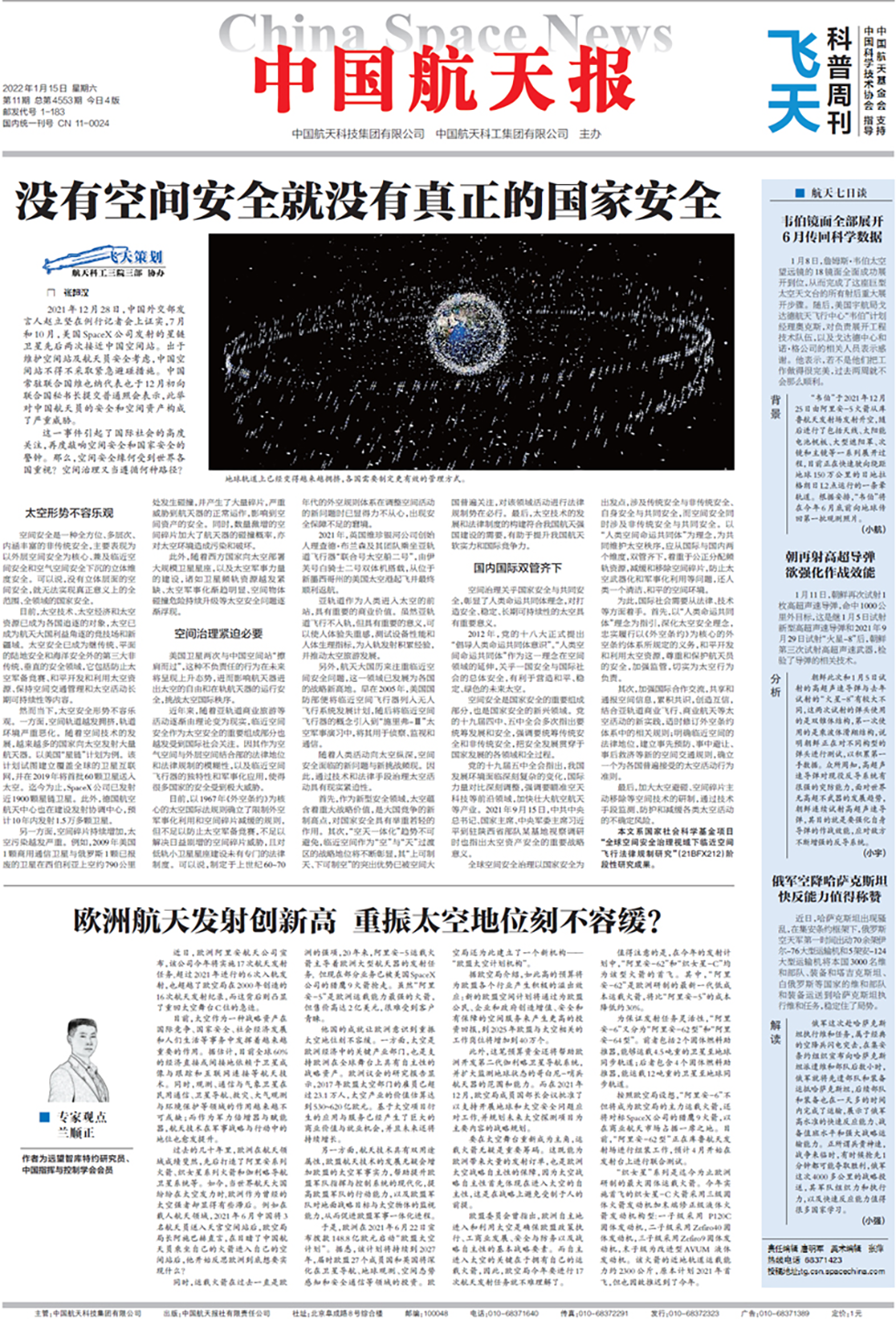 2022115日,我院郑斌航空与空间法研究所副所长、中国国际法学会理事张超汉撰写的评论性文章《没有空间安全,就没有真正的国家安全》在国内航天领域权威性媒体《中国航天报》头版、头条刊发。