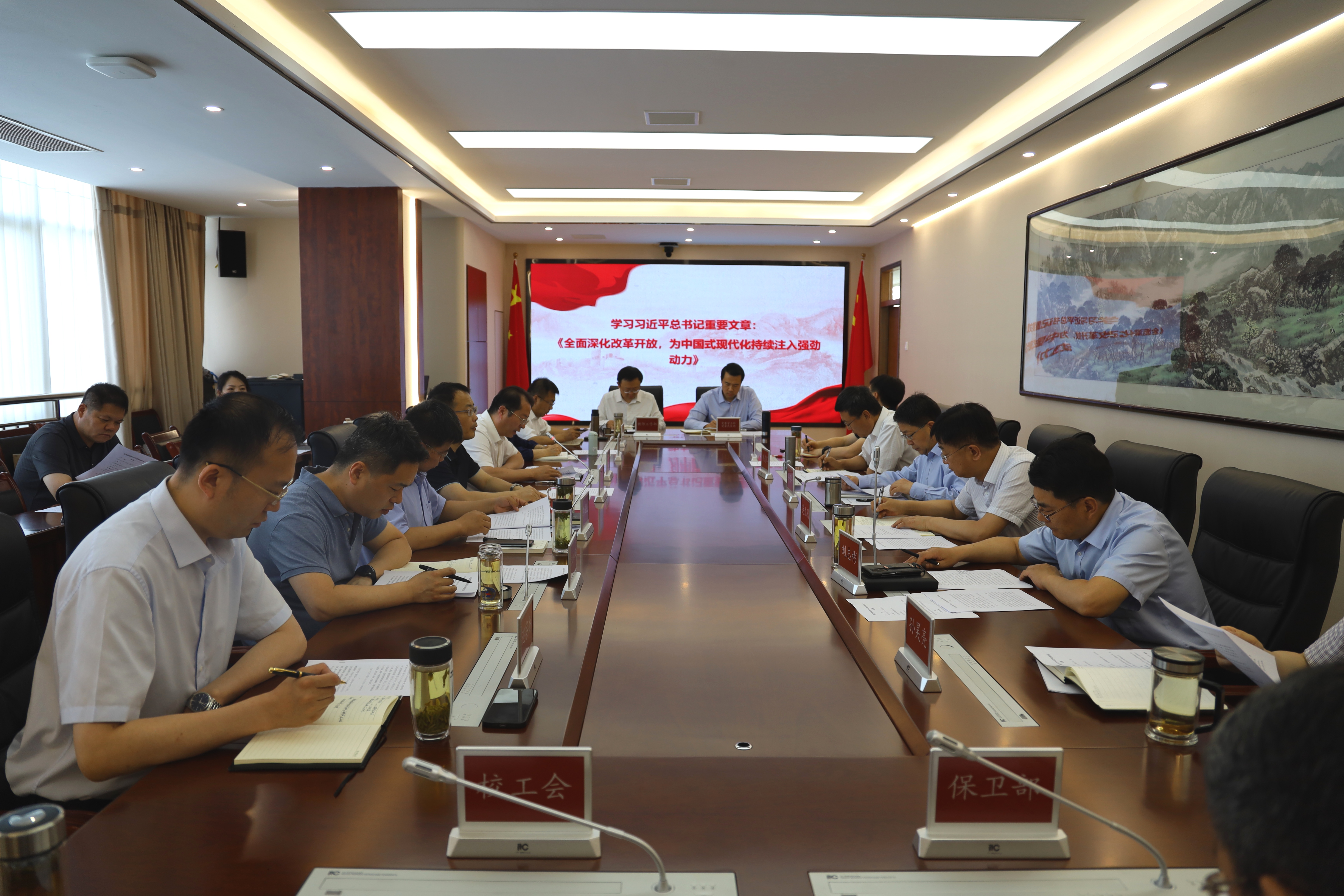 会议学习了习近平总书记在企业和专家座谈会上的重要讲话精神、在《求是》杂志发表的重要文章《全面深化改革开放,为中国式现代化持续注入强劲动力》;学习了《中国共产党纪律处分条例》部分章节。校党委书记孙国华,校党委副书记郭武军,校党委副书记、纪委书记、监察专员刘志彬,副校长张荣刚,校党委委员、研工部部长宋白,党政办主任蒋国纲,校党委学工部(武装部)部长、学生处处长杨明进行了交流。