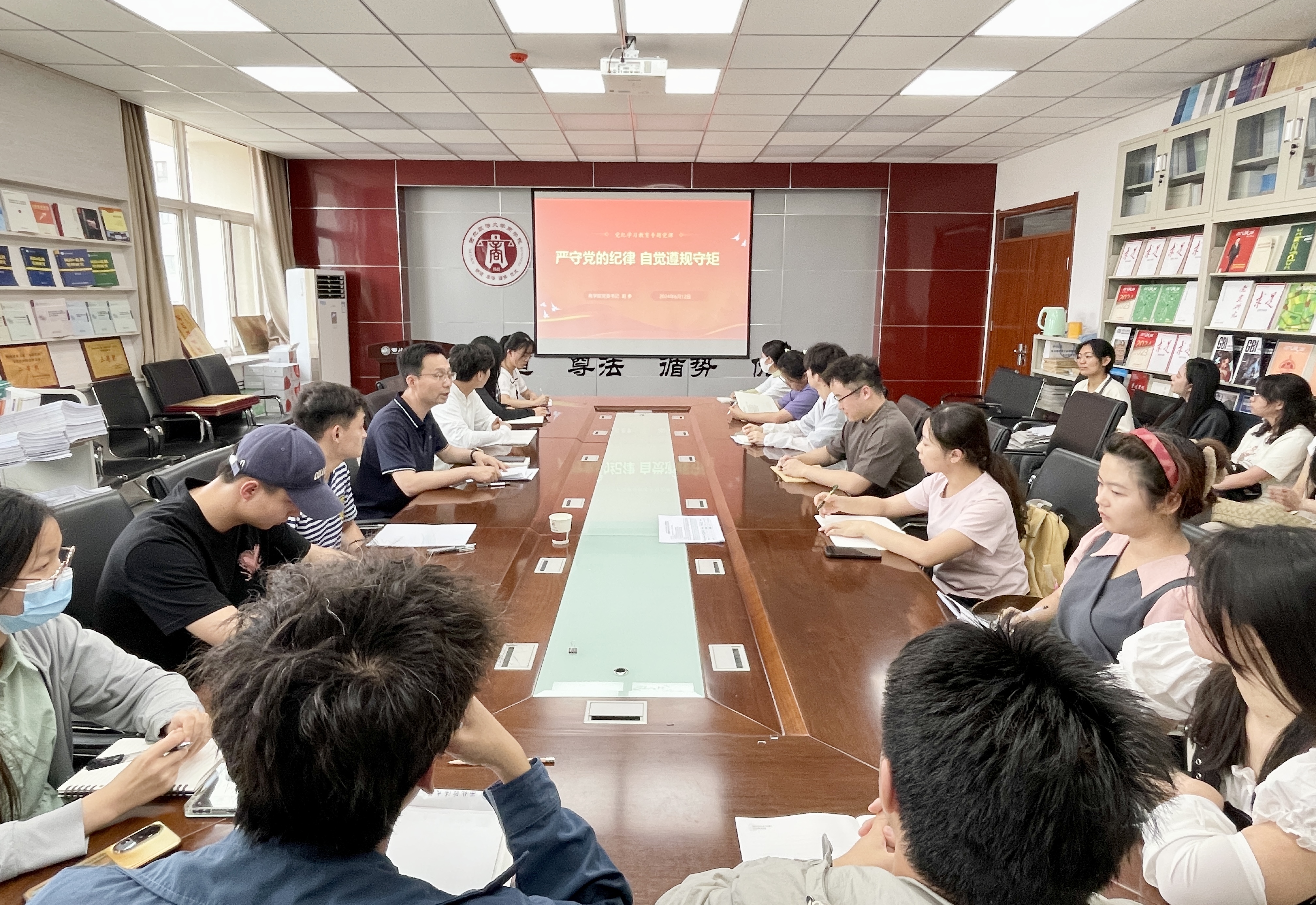 6月12日,商学院党委书记赵参在诚意楼617室为学生党员讲授党纪学习教育专题党课。各年级党员代表20余人参加学习。