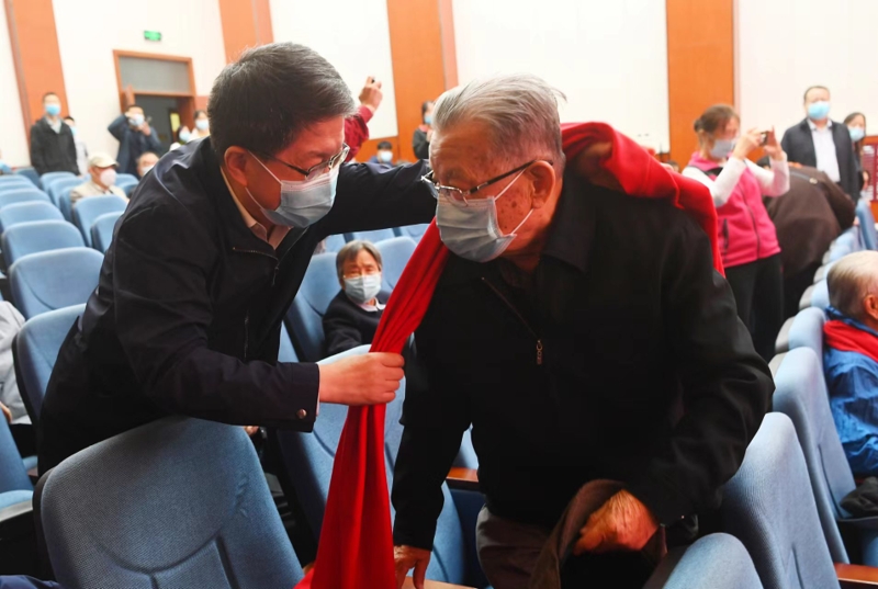 庆祝活动开始,孙国华、范九利为老寿星们送上象征吉祥幸福的红围巾。