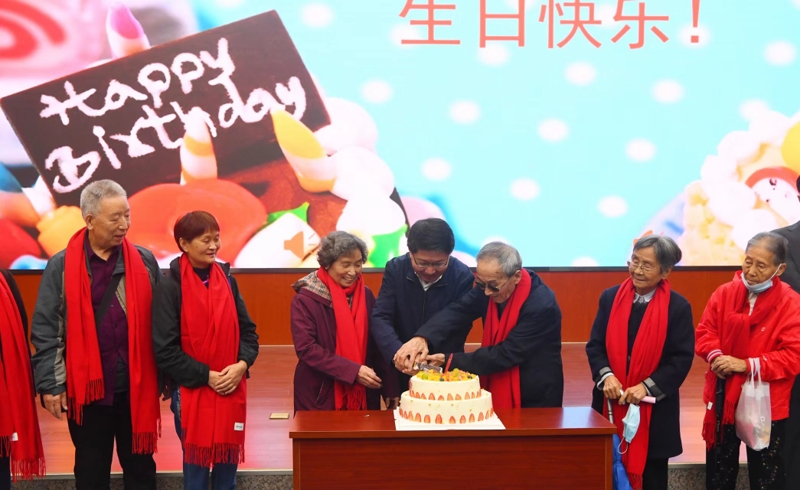 在欢快的生日快乐歌声中,校领导为老寿星们切送生日蛋糕,合影留念,并祝福他们幸福安康,健康长寿。