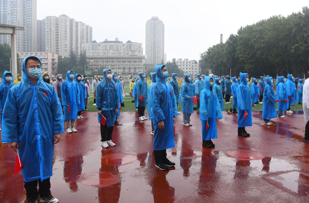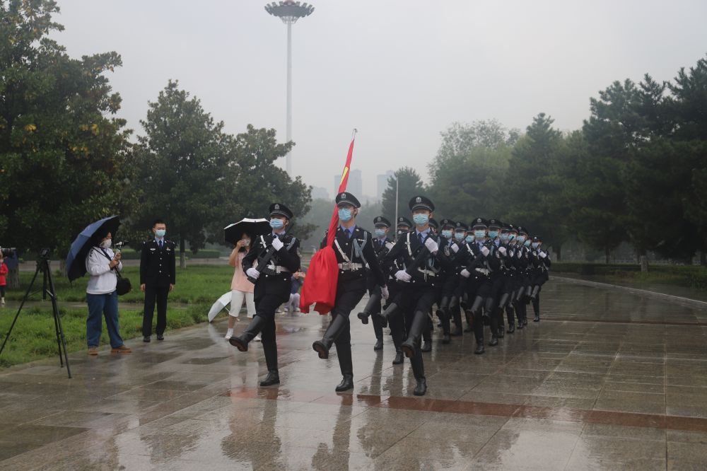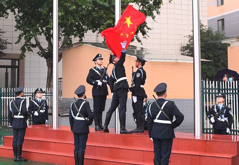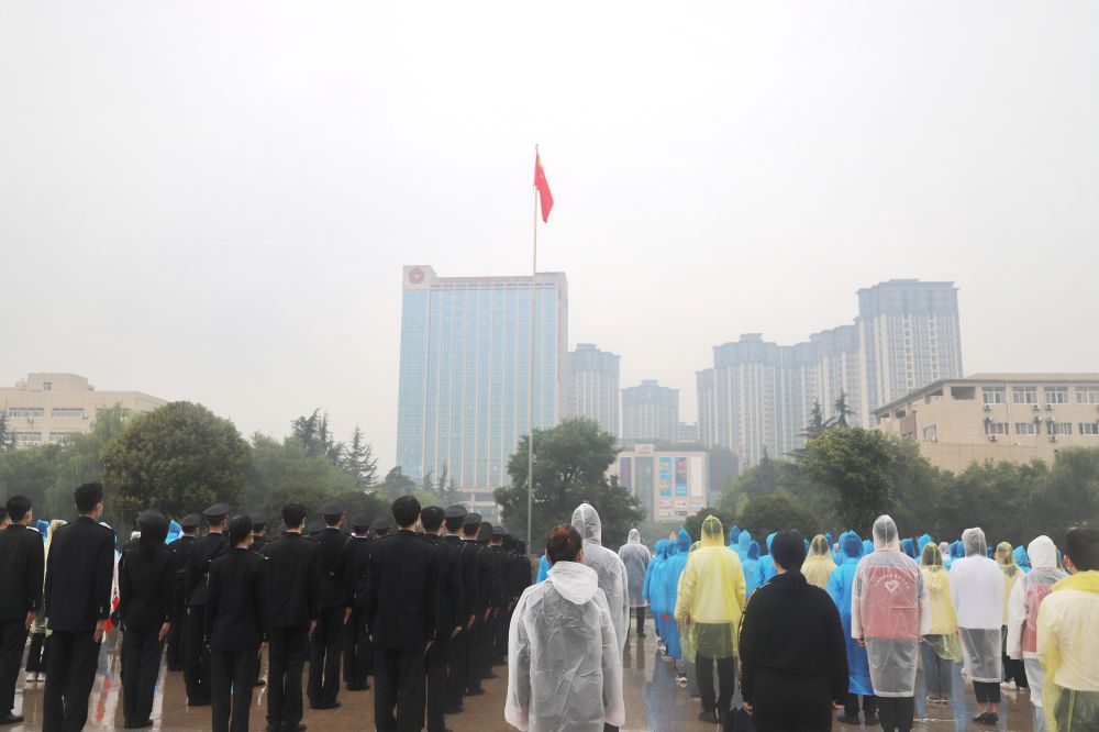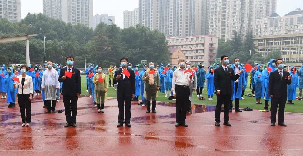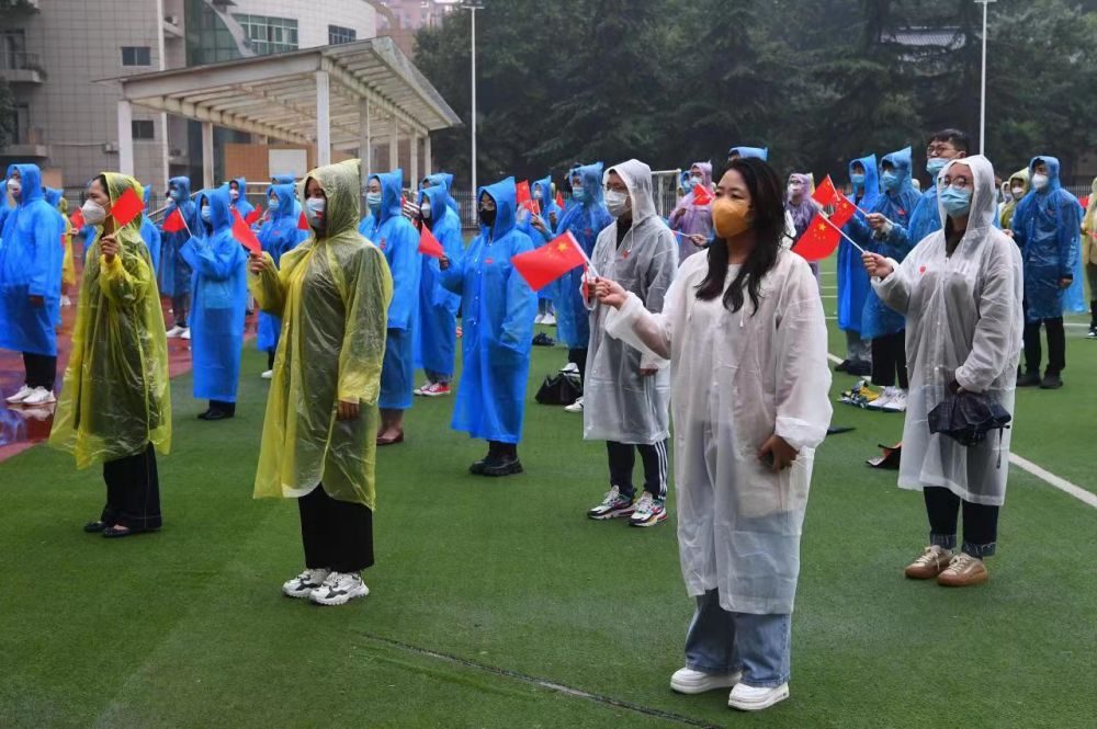 细雨连绵,但师生们却心潮澎湃,国旗护卫队精神饱满、步伐坚定,护卫着五星红旗,踏雨而来,肃穆庄严,伴随着激昂的《义勇军进行曲》,鲜艳的五星红旗冉冉升起,全体人员齐唱国歌,广场中正在参与核酸检测的师生们,也都默默地停下了手中的工作,面向国旗行注目礼,表达着对祖国的炽爱和崇高的敬意。