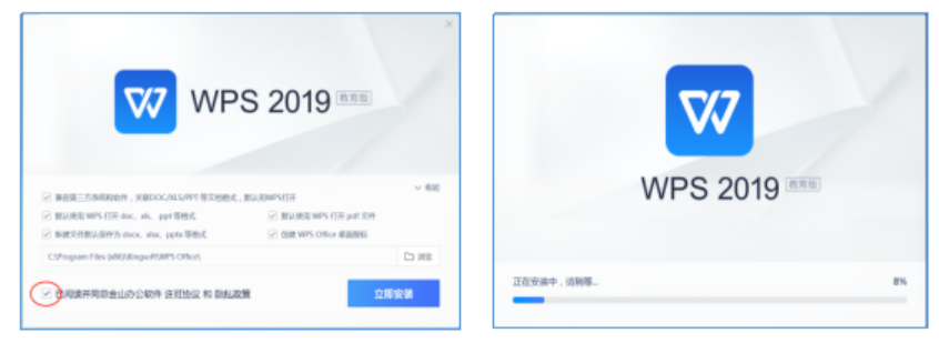 6.双击运行前一步下载好的安装程序,勾选已阅读并同意金山办公软件许可协议和隐私策略,鼠标单击立即安装,直到安装进度条100%并弹出安装完成,此版本安装后自动激活。