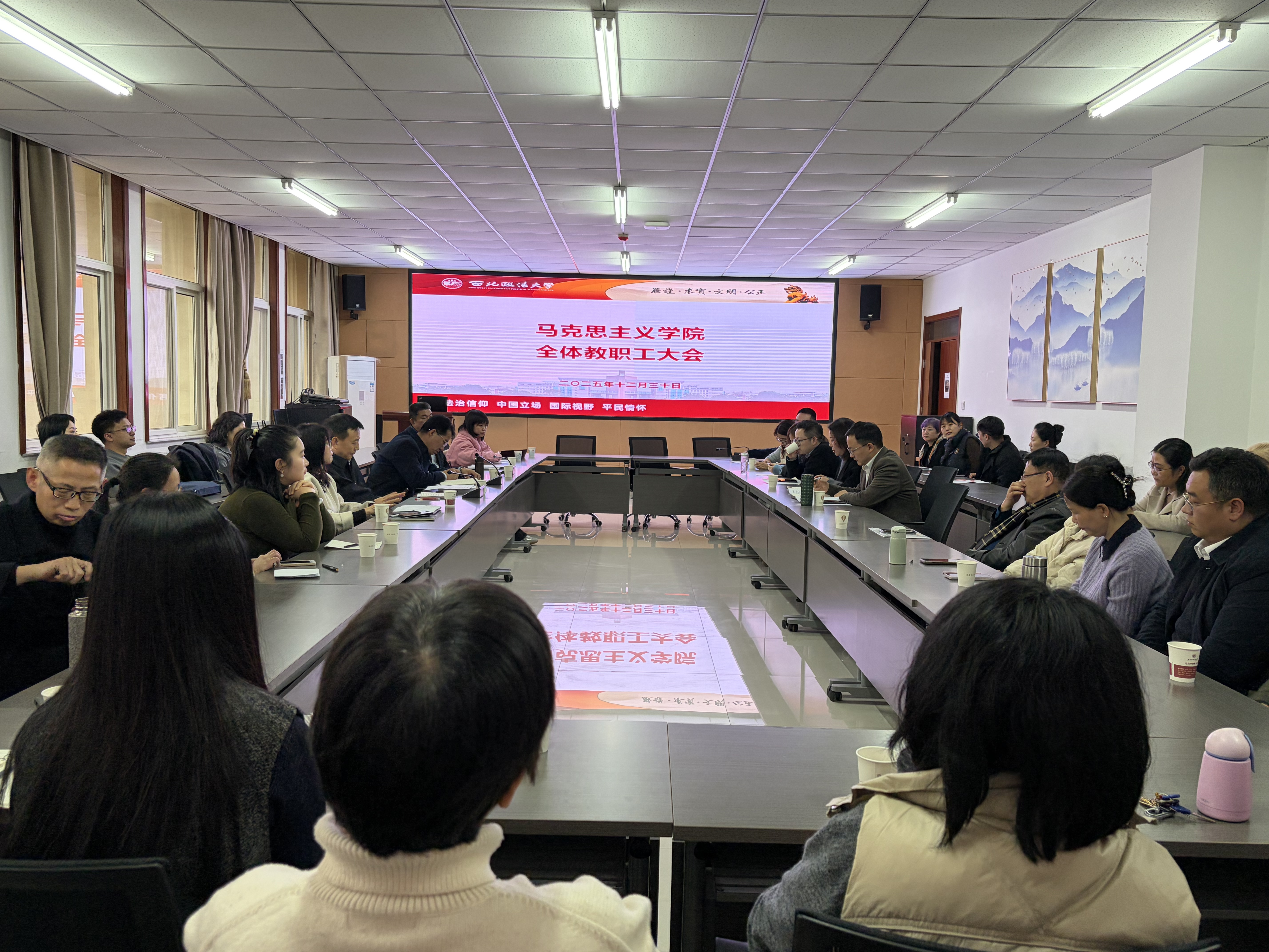 为统筹推进学院各项重点工作,明确发展方向,凝聚奋进力量,12 月 30 日,马克思主义学院召开新一届领导班子首次会议暨全体教职工大会。校党委副书记张军政出席会议,校党委委员、副校长、马克思主义学院院长马朝琦主持会议,学院党委书记李政敏,常务副院长郭淼,副院长鞠娟、李伟弟、徐鹏及全体教职工参会。 张军政对学院新一届领导班子展现出的 “起步即冲刺、开局即决战” 的昂扬精气神给予高度肯定。他表示,新班子以 “时不我待、只争朝夕” 的紧迫感迅速进入角色,定位精准不跑偏、底数清透无盲区、情况明晰无死角,工作思路既兼具系统性与创新性,又紧扣学院发展核心;围绕大思政、大平台、大项目确立的近期目标纲举目张,既鼓舞人心又催人奋进,充分彰显了新班子的责任担当与务实作风。他强调,学院作为学校思想政治教育的主阵地、主渠道,肩负着培养担当民族复兴大任的时代新人重要使命。希望全体教职工进一步提高政治站位,强化责任担当,切实履行职责使命;要健全完善运行机制,加强沟通协作、凝聚发展共识,以更高标准、更实举措推动学科建设、教学科研、人才培养等各项工作再上新台阶,为学校高质量发展作出更大贡献。 马朝琦代表学院对前任领导班子成员为学院建设与发展所付出的辛勤努力和取得的显著成绩表示衷心感谢,并向全体教职工介绍了学院新任领导班子成员和职责分工。同时,他对下一步学院教学改革、科研申报、人才队伍建设等重点工作进行了安排部署,希望学院上下一心、凝心聚力统筹推进好各项工作。 李政敏结合近期重点工作作出安排,他表示,要高质量完成党支部书记述职评议等年终考核工作,充分发挥考核的激励导向作用;要切实筑牢安全防线,扎实做好近期师生安全稳定及意识形态工作,及时排查化解各类风险隐患;要持续推进学院科研平台建设,整合优质资源、明确研究方向、强化团队协作,为学院发展注入新动力。 郭淼在发言中表示,学院新任领导班子要广泛听取师生对学院的意见建议,凝聚集体智慧,形成发展合力;要加快推进建章立制工作,对学院现有规章制度进行系统梳理与完善,为学院各项工作的规范化运行提供制度保障;要紧密围绕学校 “十五五”规划总体部署,科学谋划学院中长期发展规划,明确发展目标和实施路径,推动学院事业持续健康发展。 会上,鞠娟、李伟弟、徐鹏分别结合各自分管工作进行了发言。 此次会议的召开,进一步统一了思想、明确了方向、凝聚了共识。大家纷纷表示,将以此次会议为契机,立足本职岗位,主动担当作为,积极投身学院各项工作,共同推动学院发展再上新台阶。 (供稿:马克思主义学院 撰稿:韩筱煜 审核:李政敏)