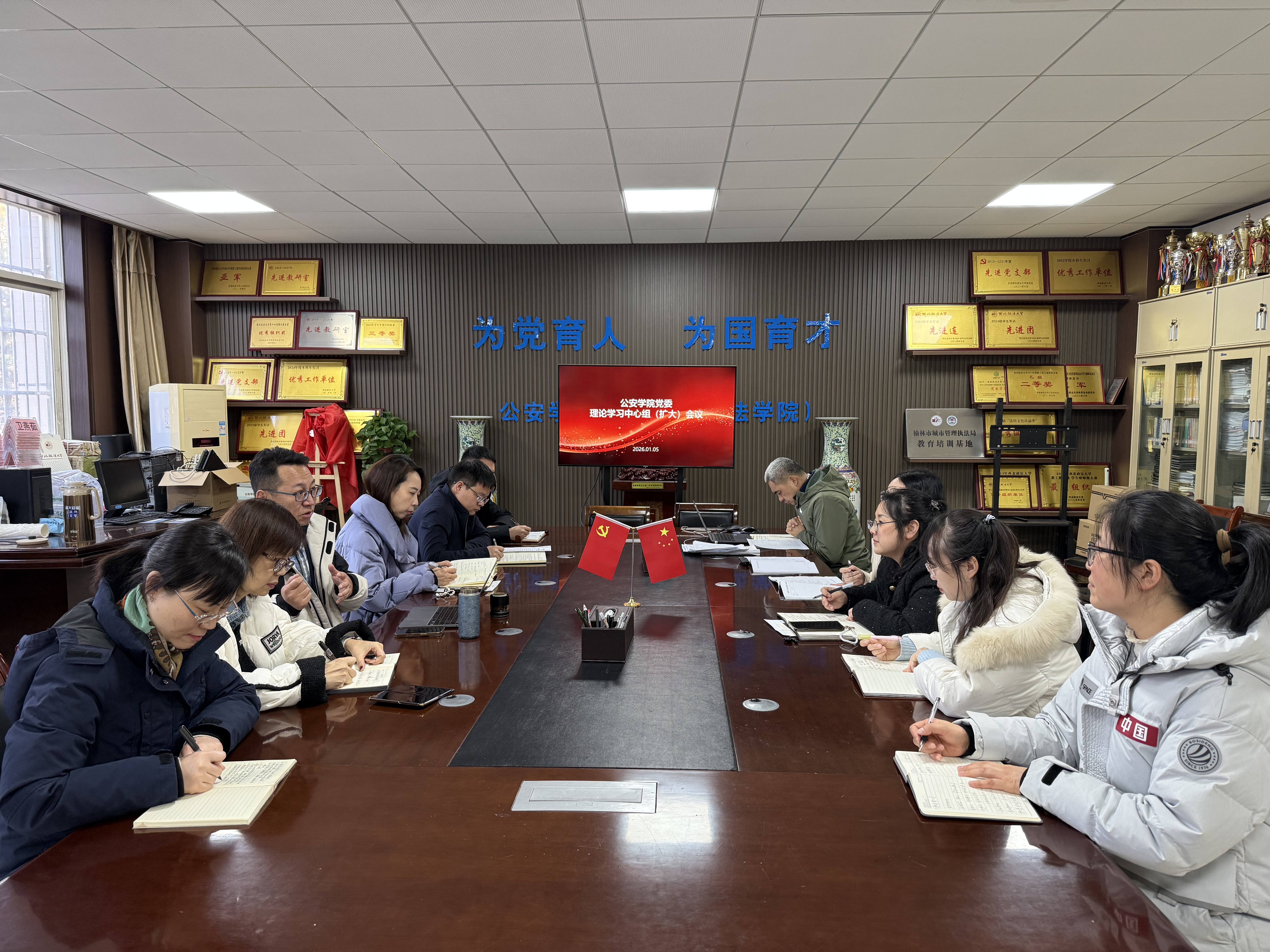1月5日,公安学院党委在学院资料室召开理论学习中心组(扩大)学习会议,学院中心组成员、科级干部、辅导员参加会议,学院党委书记上官亚敏主持会议。 会议集体学习了习近平总书记在中共中央政治局民主生活会上的重要讲话精神、在《求是》杂志发表的重要文章《推进党的自我革命要做到“五个进一步到位”》,学习习近平主席发表的二〇二六年新年贺词,传达校党委理论学习中心组(扩大)会议精神。 会议要求,要准确把握“五个进一步到位”的实践要求,坚决把中央八项规定作为铁规矩、硬杠杠,将自我革命精神融入管党治党、办学治校全过程,营造风清气正的育人政治生态。要持续深化作风建设,牢固树立重实干、求实绩的鲜明导向,锻造“崇尚实干、狠抓落实”的过硬作风,强化服务意识,激发内生动力,不折不扣落实好学校各项决策部署。要持续加强领导班子建设,以提升核心办学指标为目标,认真思考“服务地方经济社会发展”“提升思政育人质效”等核心议题,进一步彰显学院特色优势,明思路、定措施、抓落实,稳扎稳打推进2026年工作。 (供稿:公安学院(公共安全法学院) 撰稿:李辉 张瑾 审核:上官亚敏)