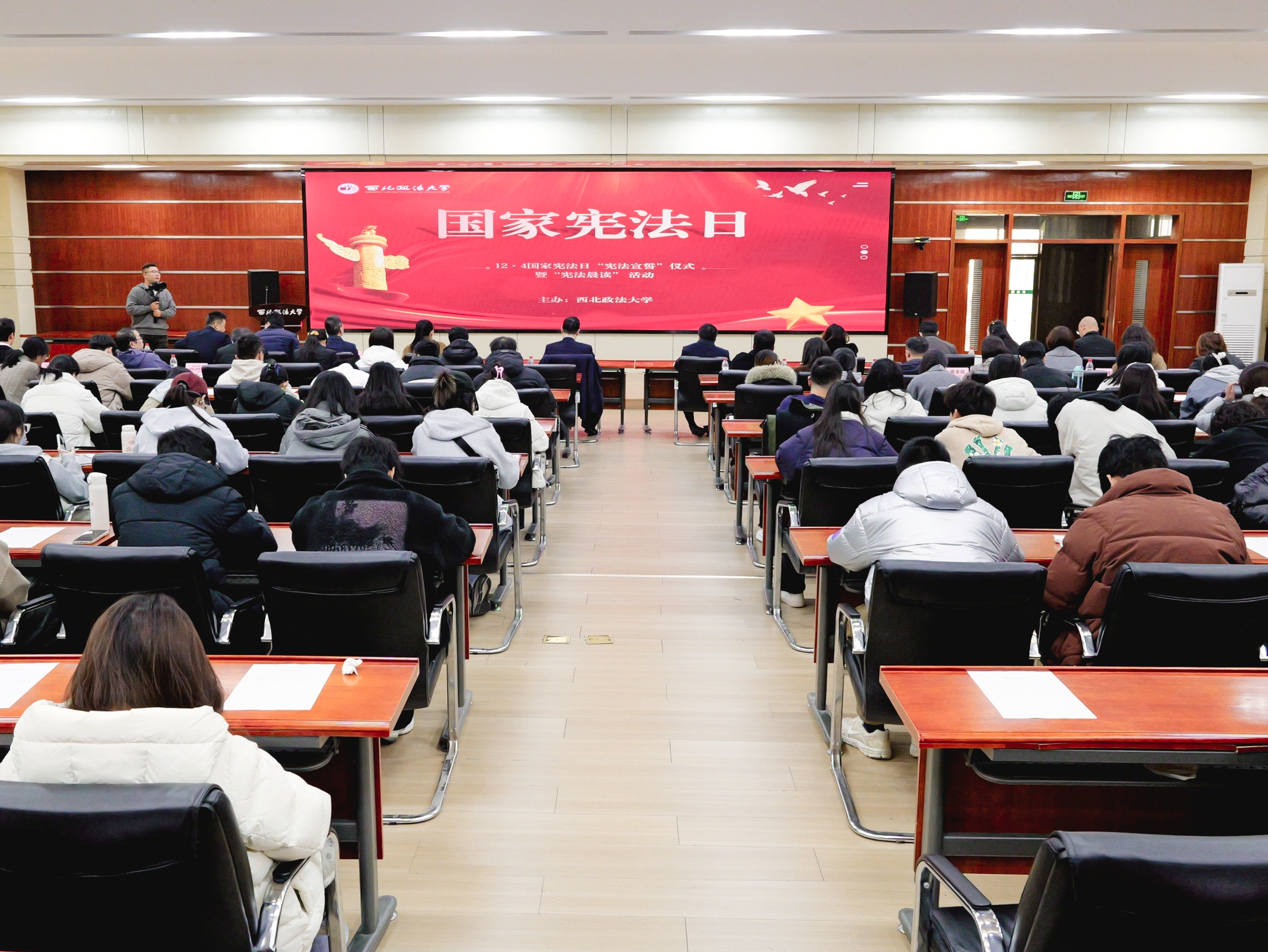 12月4日上午,ac米兰在长安校区图书馆一楼学术报告厅举行第十二届国家宪法日“宪法宣誓”仪式暨“宪法晨读”活动。副校长孙昊亮出席,教务处处长李大勇主持活动。 活动分两个阶段进行。第一阶段,全体参会师生观看了国家宪法日宣传片,在经济学院2024级卫文斌同学的带领下,郑重宣誓:“忠于中华人民共和国宪法,维护宪法权威,履行法定职责,忠于祖国、忠于人民,恪尽职守、廉洁奉公,接受人民监督,为建设富强民主文明和谐美丽的社会主义现代化强国努力奋斗!”;第二阶段,全体参会人员同步线上参与全国青少年普法网络直播,进行线上宪法晨读。 通过本次宪法宣誓仪式及宪法晨读活动,广大师生深入了解宪法精髓,大力弘扬了宪法精神与社会主义法治精神,从中汲取伟大民族精神的力量,增强法律意识,提升法律素养。充分调动了同学们学习宪法的积极性,有效提高了学生宪法知识的储备量,使同学们对宪法精神有了更深层次的领悟。今后,学校将持续组织开展形式多样、内容丰富的宪法宣传活动,持续深入开展宪法宣传与法治教育,实现“立德树人、德法兼修、学思践悟、知行合一”的实践教学目标,营造“多层次、多元化、内容丰富、特色鲜明”的校园法治文化氛围。 党政办、党委宣传部、学工部、研工部、教师工作部、校团委、教务处等职能部门负责人,各学院学生工作负责人和全校200余名学生代表参加活动。 (供稿:教务处 撰稿:殷晓明 审核:李大勇)