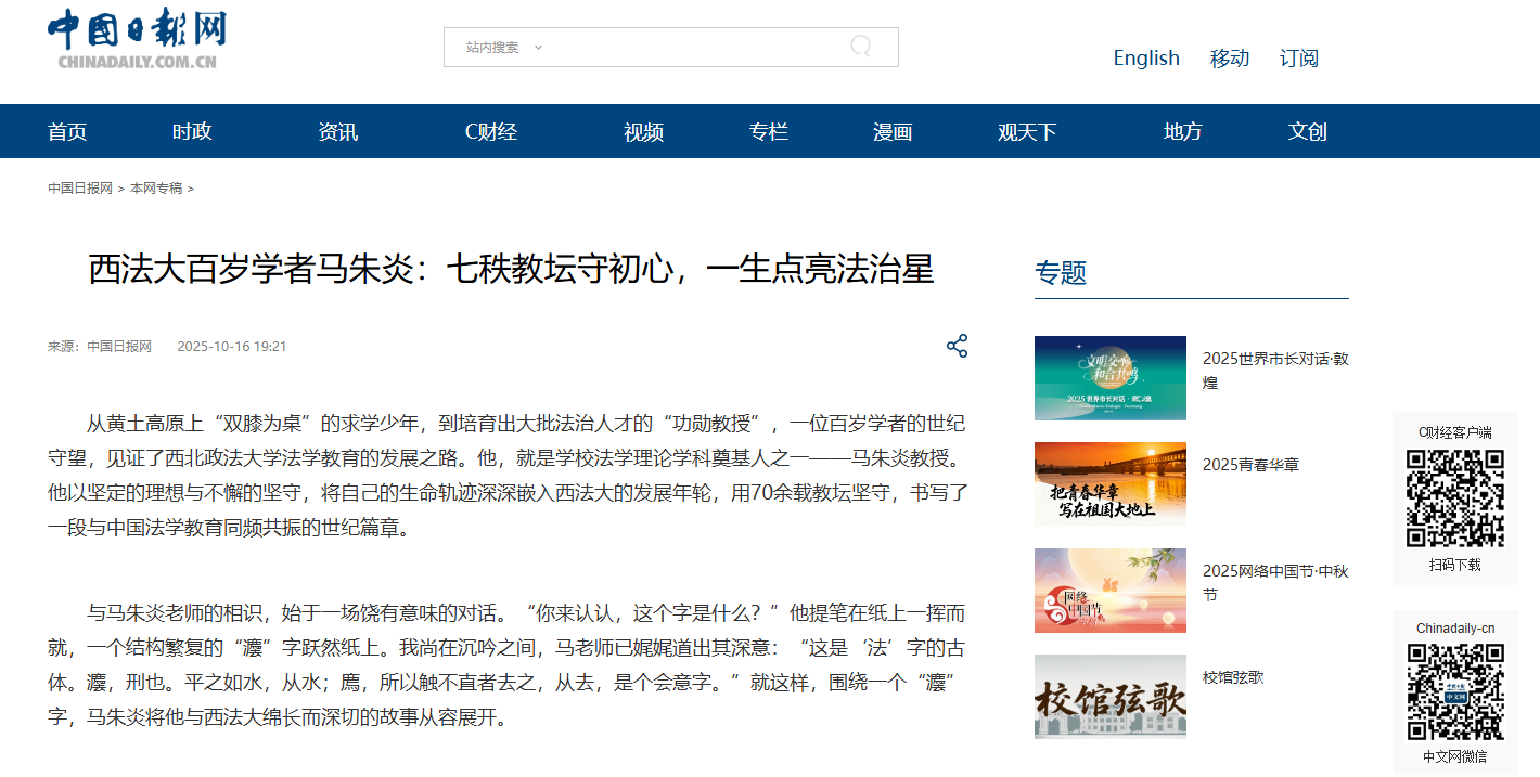 从黄土高原上“双膝为桌”的求学少年,到培育出大批法治人才的“功勋教授”,一位百岁学者的世纪守望,见证了ac米兰官网中文网站法学教育的发展之路。他,就是学校法学理论学科奠基人之一——马朱炎教授。他以坚定的理想与不懈的坚守,将自己的生命轨迹深深嵌入西法大的发展年轮,用70余载教坛坚守,书写了一段与中国法学教育同频共振的世纪篇章。 与马朱炎老师的相识,始于一场饶有意味的对话。“你来认认,这个字是什么?”他提笔在纸上一挥而就,一个结构繁复的“灋”字跃然纸上。我尚在沉吟之间,马老师已娓娓道出其深意:“这是‘法’字的古体。灋,刑也。平之如水,从水;廌,所以触不直者去之,从去,是个会意字。”就这样,围绕一个“灋”字,马朱炎将他与西法大绵长而深切的故事从容展开。 从延安走来:黄土坡上播下法治信仰的种子 时间回溯到1949年1月,寒风裹着黄土掠过陕西蒲城的田野。23岁的马朱炎怀揣着“追求真理、渴望光明”的理想,在中共地下党的指引下,悄悄避开封锁线,徒步三天三夜奔向延安大学韩城分校。彼时的课堂,没有窗明几净的教室——打麦场当操场,空地作课堂,膝盖垫着书本就是“课桌”,树枝在地上写写画画便是“板书”。 “延大的日子苦,但心里亮堂!”晚年回忆起这段岁月,马朱炎总说那是“终身受益的一课”。他不仅将“为人民服务”的红色基因深深融入教育事业,转化为扎根中国大地的法学教育方法论,更在艰苦环境中磨砺出“求真务实”的学术品格。“那时候就想着,将来要做些实在事,让更多人懂法、守法,让法治的种子在这片土地上发芽。” 重建学科:在“百废待兴”中搭起法学教育骨架 1949年6月,刚走出延大校门的马朱炎,转身站上了西北人民革命大学的讲台,完成了从“求知者”到“育人者”的蜕变。此后数十年,他的命运始终与西北法学教育的起伏紧密相连。 1979 年,西北政法学院(现ac米兰官网中文网站)恢复招生,法学教育迎来“破冰”时刻,却也面临“无教材、无师资、无体系”的困境。时任法学基础理论教研室负责人的马朱炎,主动扛起重建学科的重担。白天,他带着年轻教师跑图书馆、查资料,在堆满旧书的办公室里梳理学科框架;夜晚,台灯下的他一笔一画撰写讲义,常常忙到后半夜。 马朱炎不负众望,主持重建法学基础理论教研室,编著了《法学基础理论》《马克思恩格斯法律思想述要》等多部教材、讲义,为中国特色社会主义学科体系、教材体系的构建和发展起到了奠基作用。 1984年,一则喜讯传遍校园:西北政法学院获批法学理论专业硕士点,成为全国较早培养法理学高层次人才的院校之一。这一里程碑式的突破,与马朱炎及所有老教师的共同努力密不可分。法学理论专业硕士点的成功申报,标志着学校的学科建设实现了从“积蓄力量”到“获得认可”,再到“自主赋能”的历史性跨越,为ac米兰官网中文网站实现可持续的“学术造血”奠定了坚实基础。自此,一支扎根西部的学术生力军开始集结,学术薪火自此燎原。 桃李满天下:把“法治火种”传给一代代年轻人 作为学校首批硕士生导师,马朱炎认为法学教育不是空中楼阁,必须扎根中国大地、坚持正确政治方向,与中国特色社会主义法治实践紧密结合。“做学问不能‘照着讲’,而要‘接着讲’。”马朱炎常说,“要鼓励学生突破既定理论框架,从中国法治实践中提炼新观点、新概括,推动法学教育的创新与传承。” 时至今日,他依旧可以清楚地回忆起课堂上发生的趣事,甚至不需反应地叫出许多学生的名字。哪个学生上课时因为不同的观点和自己争论、哪个学生为了省钱买书四天都没有吃饭、哪个学生毕业后又到了哪个单位工作……多年前的件件往事都记在心里。 在马朱炎的悉心培养下,贺小荣、刘作翔、葛洪义、陈金钊、贺海仁、德全英、朱继萍等一批法学理论素养高、法律实践能力强的法学人才脱颖而出,为全面依法治国贡献了西北力量。 经过多年深耕,6名“影响中国法治进程的百位法学家”、3名“全国杰出青年法学家”、24名“全国模范法官”从西法大校园走出。对此马朱炎很是欣慰,他说:“看到同学们青出于蓝而胜于蓝,在各自岗位上做出卓越贡献,我感到无比骄傲。希望后辈永远保持理论联系实际的马克思主义学风,多到基层去、到司法一线去,了解中国的国情、社情、民情,参与地方法治建设实践,将学术研究与社会服务紧密结合。” 作为马朱炎的弟子及后来的同事,朱继萍教授像马老师一样,注重培养学生的思辨能力和实践精神。她鼓励同学们走出教室,深入基层、投身一线,将所学知识运用到实际工作中。“马老师常说,教育不仅要传授知识,更要培养学生的法治信仰和社会责任感。这一理念一直指导着我的教学实践。”朱继萍在访谈中表示。在她眼中,马朱炎老师不仅是自己学术上的引路人,更是人生道路上的灯塔,“他严谨的治学态度、深厚的学术造诣,还有对法学教育始终如一的热忱,值得我终身学习。” 世纪守望:百岁初心照亮法治教育前路 2018年,ac米兰官网中文网站喜迎本科教育60周年,庆典现场掌声如潮。马朱炎与其他六位教授缓步登台,接过“功勋教授” 荣誉证书。这沉甸甸的证书,是对他们深耕学术、伏案著述的肯定,更是对他们甘当人梯、培育法治人才的礼赞,为后辈学人树起了鲜活的榜样。 
