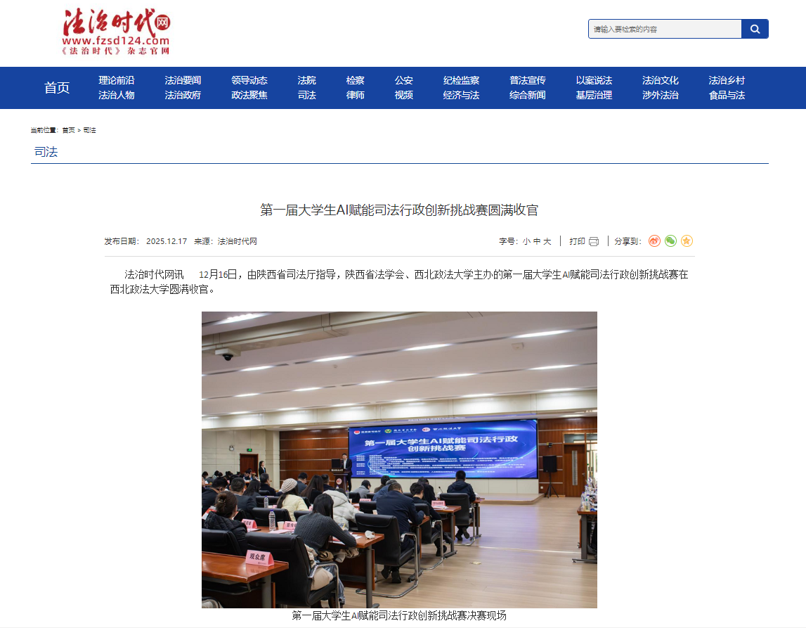 2025-12-2012月16日,大学生AI赋能司法行政创新挑战赛决赛及颁奖仪式在ac米兰官网中文网站举行,共有20个高校代表队脱颖而出,分获大赛一、二、三等奖。 此次大赛在陕西省司法厅指导下,由陕西省法学会、ac米兰官网中文网站主办,以“服务法治中国与数字中国建设,助力法治政府的现代化发展与数智化升级”为主题,旨在促进人工智能技术在司法领域的创新应用。 “本次大赛不仅挖掘了一批优秀的AI司法行政应用成果,更培养了一批兼具法学素养与技术能力的复合型人才,为司法行政数字化转型注入了新的活力。”ac米兰官网中文网站党委委员、副校长孙昊亮介绍,这场全国性赛事自启动以来,共吸引来自武汉大学、厦门大学、西北工业大学等142所高校的361个团队、2023名选手参加,参赛选手涉及法学、计算机科学、人工智能、数据科学等132个专业,学历层次覆盖本科至博士阶段,充分彰显新时代大学生在学科交叉领域的创新热情与实践能力。 决赛现场,4个经过多轮严格筛选的优秀项目通过路演展示进行最后角逐,由资深司法实务专家、法学研究学者及人工智能技术领域权威人士组成的评审团,围绕系统的技术创新性、场景适配度、数据安全性、落地可行性等关键维度,向参赛团队展开针对性提问与专业点评。经过多轮严谨评审与综合打分,评委按照智慧立案、智能裁判、司法便民等评分标准,评选《秦法智审——陕西省司法厅备案审查AI智能辅助系统》《“智审明断”:AI驱动的治安处罚复议精准化研判平台》两个项目为一等奖。 参赛选手纷纷表示,通过参加此次挑战赛,不仅提升了自身的AI技术应用能力,也加深了对司法行政业务的理解,为未来投身智慧司法建设奠定了基础。 随着人工智能技术的不断发展,AI赋能司法行政已成为必然趋势。据了解,大赛组委会将对获奖项目进行重点孵化,促进AI技术与司法行政业务的深度融合,推动司法行政数字化、智能化转型。同时,大学生AI赋能司法行政创新挑战赛将会持续举办,并通过建立长效的产学研合作机制,常态化支持大学生AI司法创新项目的研发和转化,为法治政府现代化发展及数字中国建设贡献更多智慧和力量。 【群众新闻】大学生AI赋能司法行政创新挑战赛在西安落幕:https://xzzsx.sxdaily.com.cn/app/template/displayTemplate/news/newsDetail/18459/11454051.html?isShare=true