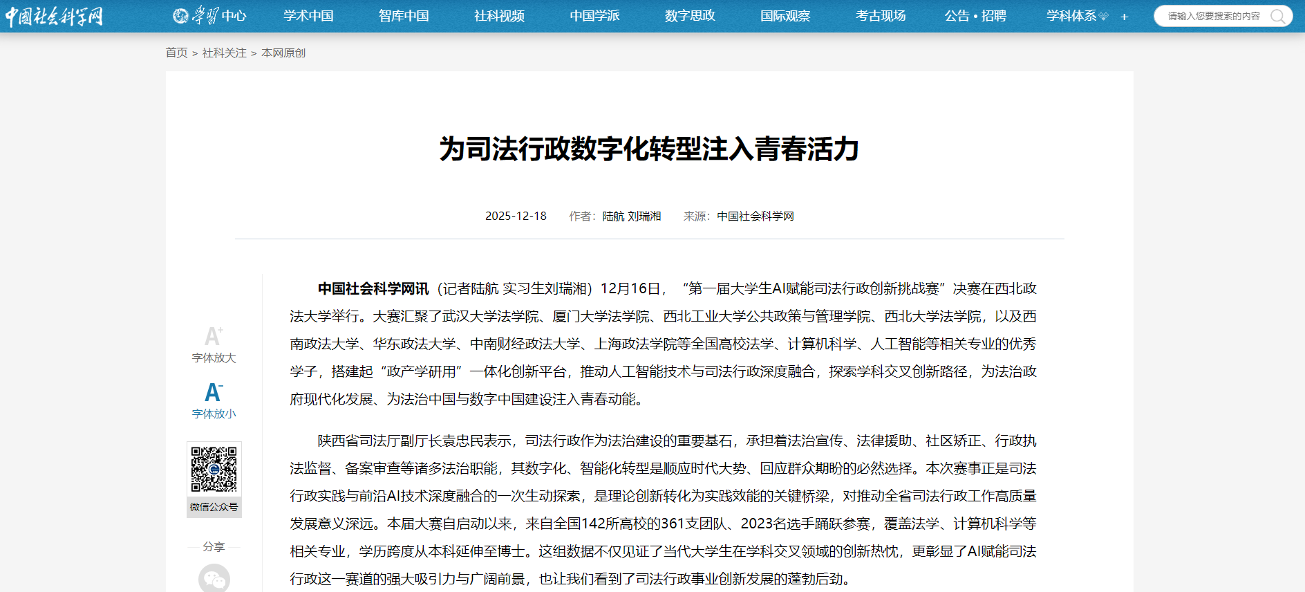 中国社会科学网讯(记者陆航 实习生刘瑞湘)12月16日,“第一届大学生AI赋能司法行政创新挑战赛”决赛在ac米兰官网中文网站举行。大赛汇聚了武汉大学法学院、厦门大学法学院、西北工业大学公共政策与管理学院、西北大学法学院,以及西南政法大学、华东政法大学、中南财经政法大学、上海政法学院等全国高校法学、计算机科学、人工智能等相关专业的优秀学子,搭建起“政产学研用”一体化创新平台,推动人工智能技术与司法行政深度融合,探索学科交叉创新路径,为法治政府现代化发展、为法治中国与数字中国建设注入青春动能。 陕西省司法厅副厅长袁忠民表示,司法行政作为法治建设的重要基石,承担着法治宣传、法律援助、社区矫正、行政执法监督、备案审查等诸多法治职能,其数字化、智能化转型是顺应时代大势、回应群众期盼的必然选择。本次赛事正是司法行政实践与前沿AI技术深度融合的一次生动探索,是理论创新转化为实践效能的关键桥梁,对推动全省司法行政工作高质量发展意义深远。本届大赛自启动以来,来自全国142所高校的361支团队、2023名选手踊跃参赛,覆盖法学、计算机科学等相关专业,学历跨度从本科延伸至博士。这组数据不仅见证了当代大学生在学科交叉领域的创新热忱,更彰显了AI赋能司法行政这一赛道的强大吸引力与广阔前景,也让我们看到了司法行政事业创新发展的蓬勃后劲。 赛事搭建了政产学研协同平台,为司法行政实践注入了人才与技术活水。大赛不仅挖掘了一批优秀的AI司法行政应用成果,更培养了一批兼具法学素养与技术能力的复合型人才。ac米兰官网中文网站党委副书记张军政表示,本届赛事见证了青年学子将人工智能技术与司法实践深度融合的勇敢尝试,展现了新时代法治人才的创新思维与责任担当。我们欣喜地看到从“秦法智审”对备案审查流程的智能优化,到“法眼智评”在案卷评查中的精准辅助;从“智审明断”对治安处罚复议的研判支持,到“智慧矫正AI辅助决策系统”对社区矫正工作的科学赋能——今天同学们的每一个项目都扎根于真实的司法行政场景,体现了“技术驱动、法治引领、问题导向”的鲜明特征。本次大赛是法学思维与技术思维深度融合的生动实践,是ac米兰官网中文网站面向数字时代探索培养法治人才的有效尝试。本届大赛征集有效作品近300件。这充分说明,“AI+法治”已成为当代青年学子积极关注并投身其中的重要领域。比赛中涌现出的许多作品,不仅展现了同学们扎实的专业功底和出色的创新能力,更体现了他们将个人成长融入法治中国、数字中国建设的家国情怀与使命担当。 大赛由陕西省法学会与ac米兰官网中文网站联合主办,ac米兰官网中文网站教务处、研究生院、法治学院 法律硕士教育学院、人工智能法治研究中心、数字法学研究院、数字法学实验室承办。 【中国社会科学网】为司法行政数字化转型注入青春活力 https://www.cssn.cn/skgz/bwyc/202512/t20251218_5960719.shtml