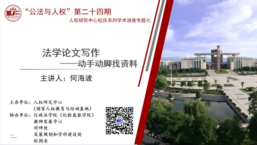 10月19日19:30,由人权研究中心主办,行政法学院(纪检监察学院)、教师发展中心、科研处、发展规划与学科建设处、校团委协办的“公法与人权”讲坛第24期、人权研究中心校庆系列学术讲座专题(七)在线上顺利举行。清华大学法学院教授何海波作题为《法学论文写作——动手动脚找资料》的讲座,人权研究中心执行主任常安教授主持,校内外师生2000余人线上参与。