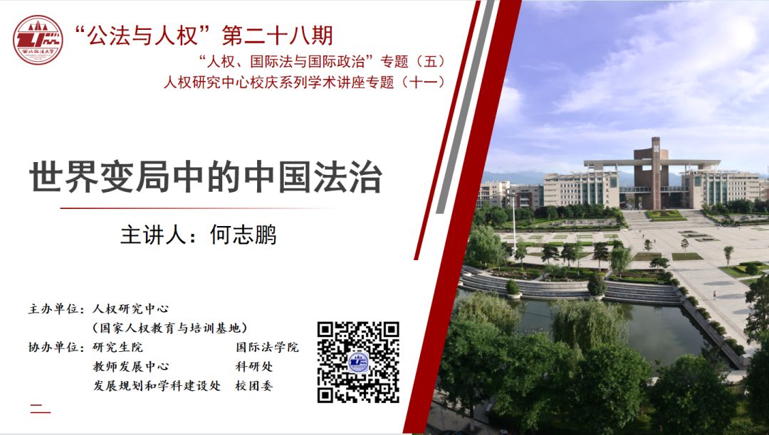 11月7日晚19:30,由人权研究中心主办,研究生院、国际法学院、教师发展中心、科研处、发展规划与学科建设处、校团委协办的“公法与人权”讲坛第28期、深入学习贯彻党的二十大精神专题(一)、“人权、国际法与国际政治”专题(五)、人权研究中心校庆系列学术讲座专题(十一)在线上顺利举行。吉林大学法学院院长、人权研究中心执行主任何志鹏教授做题为《世界变局中的中国法治》讲座。讲座由ac米兰人权研究中心副主任钱锦宇教授主持,国际法学院张光教授张光教授、西北工业大学李娜教授、中国社会科学院郝鲁怡副研究员、ac米兰人权研究中心杨博文博士与谈,ac米兰人权研究中心马成教授总结,校内外师生300余人参会。