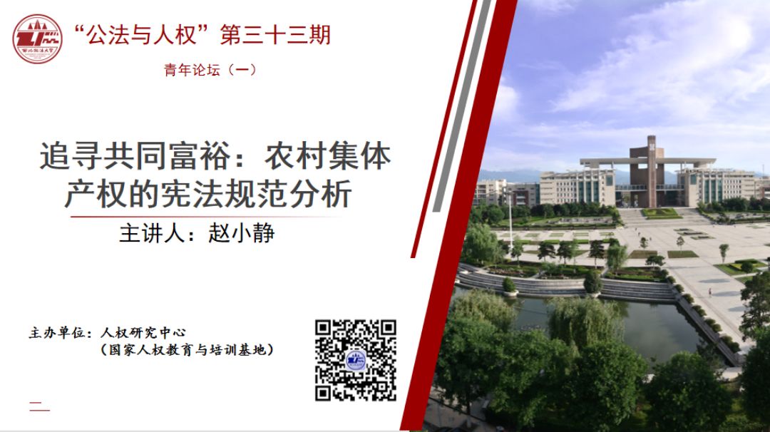 12月3日晚7:30,由人权研究中心主办的“公法与人权”第33期、青年论坛(一)在线上顺利举行。人权研究中心赵小静博士做题为《追寻共同富裕:农村集体产权的宪法规范分析》的讲座,杨博文博士主持,徐爽副教授、周斯佳博士、鲁甜博士、雷苗苗博士与谈。