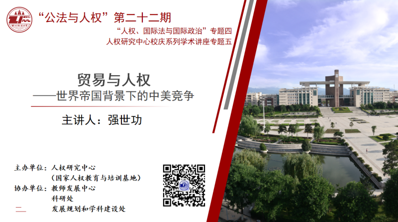 9月14日晚19:30,由人权研究中心主办,教师发展中心、科研处、发展规划与学科建设处协办的“公法与人权”讲坛第二十二期、“人权、国际法与国际政治”专题学术讲座(四)、人权研究中心校庆系列学术讲座专题(五)在线上顺利举行。北京大学法学院强世功教授做题为《贸易与人权——世界帝国背景下的中美竞争》的讲座,常安教授主持,钱锦宇教授、孟庆涛教授、魏磊杰副教授、赵小静博士、杨博文博士与谈,校内外师生600余人在线上参加讲座。