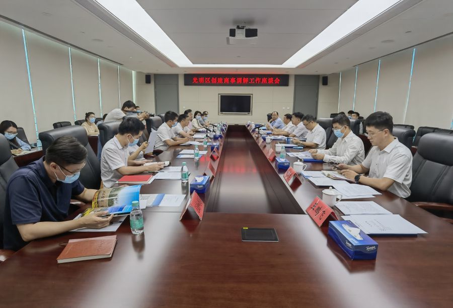15日下午,范九利一行来到深圳市光明区,在光明区副区长周柏新及相关领导的陪同下,参观了光明区公共法律服务中心和左岸科技公园展厅,和光明区司法局、民商事调解中心、区政法委和法院等10余个单位的负责人等进行了座谈交流。期间,邱浩航区长专门安排时间会见范九利一行,并表达了友好的合作意向。