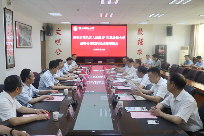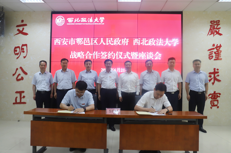 鄠邑区委常委、常务副区长舒元华与副校长张荣刚代表双方签署《战略合作协议》,并互赠礼物。鄠邑区委副书记任涛,鄠邑区委常委、政法委书记张博,鄠邑区人民检察院检察长余明涛、鄠邑区司法局局长雒永联,副校长张荣刚、马朝琦,校长助理汪世荣教授、地方政府法治建设研究中心主任王周户教授、培训中心主任李集合教授等共同见证签约。