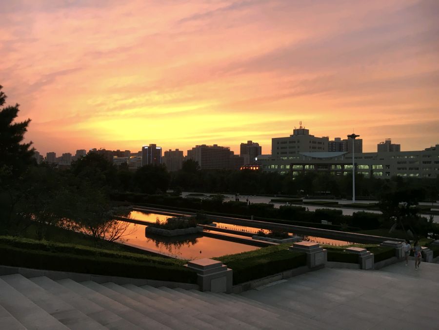 2016年的夏天,上完自习后,与好友一同走出天平楼,但见眼前霞光漫天,将整座学校罩上一层金色的薄纱,无论是石阶、天平楼广场还是不远处的图书馆,连教学楼前的水池都被夕阳镀上华丽的金黄,美得让人移不开眼。