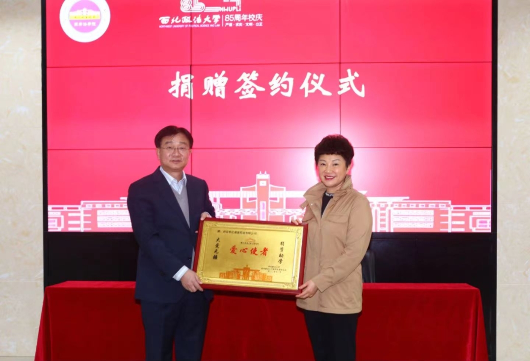 西安世纪盛康药业有限公司董事吴萍,财务部经理杨婷,1980级政治经济学专业校友、陕西省工商局广告协会原秘书长崔引长,西安万欣润龙产品物流股份有限公司董事长行松文,学校国内合作与校友工作处、教育发展基金会、经济法学院(知识产权学院)、商学院(管理学院)等相关负责同志参加了捐赠仪式。