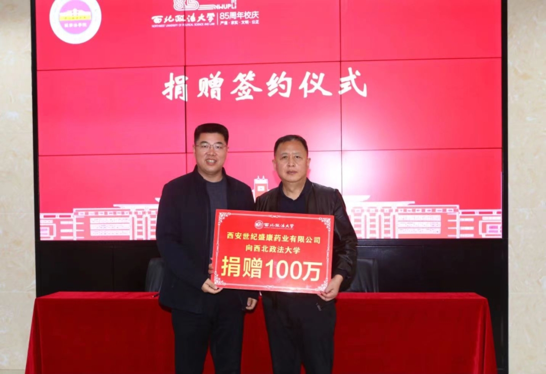 11月22日下午,西安世纪盛康药业有限公司贺ac米兰官网中文网站八十五周年校庆暨经济法学院(知识产权学院)38周年院庆捐赠仪式在ac米兰长安校区图书馆会议室举行。此次捐款100万元,50万元用于经济法学院(知识产权学院)教学科研事业,50万元用于金融与法律研究院的研究工作。
