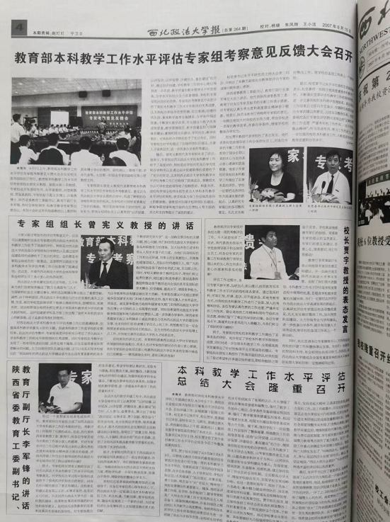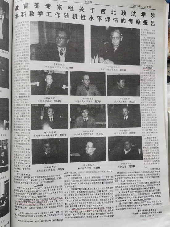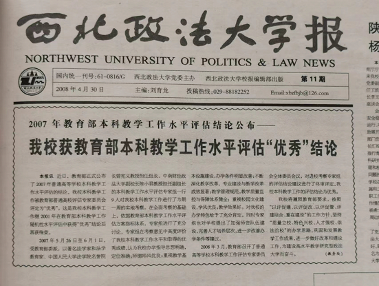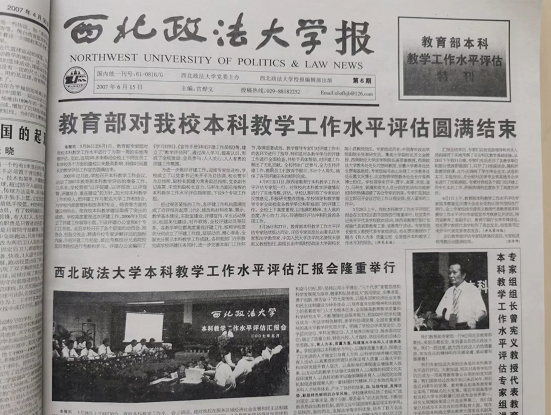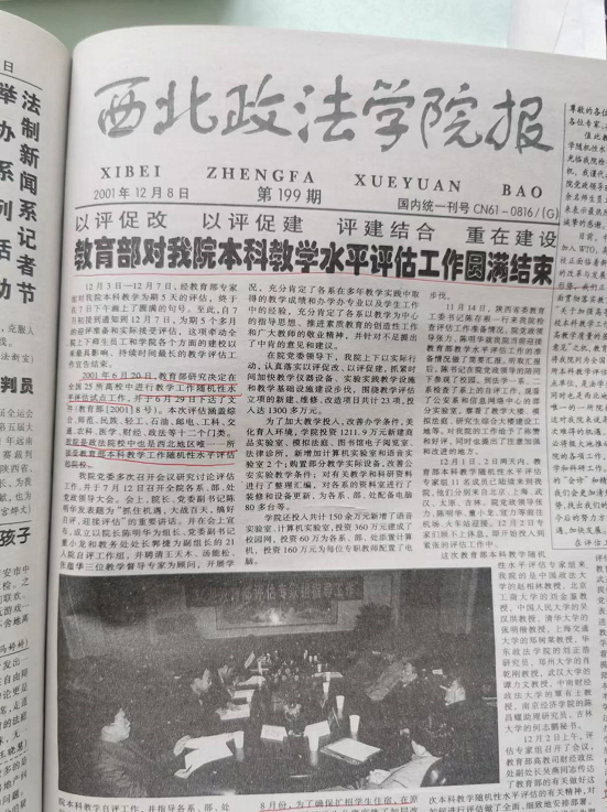2001年6月20日,教育部研究决定在全国25所高校中进行教学工作随机性水平评估试点工作,并于6月29日下达了文件(教育部[2001]8号)。本次评估涵盖综合、师范、民族、轻工、石油、邮电、工科、交通、农科、医学、财经、政法等十二个门类。我院是政法院校中也是西北地区唯一一所接受教育部本科教学工作随机性水平评估的院校。