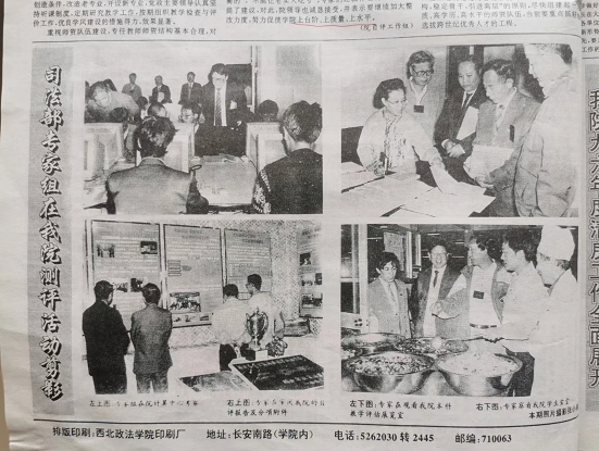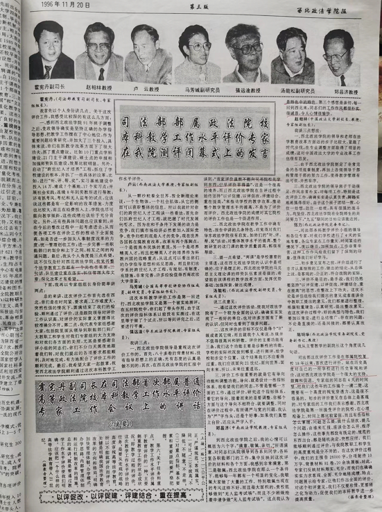 1996年11月23日至26日,司法部部属普通高等政法院校教学工作水平评价专家组,对我院本科教学工作进行了实地测评。专家组组长由司法部教育司霍宪丹副司长担任,副组长由西南政法大学卢云教授,中国政法大学副校长、赵相林担任。专家组成员有:中南政法学院郑昌济教授、华东政法学院强远淦教授、西北政法学院汤能松副研究员。专家组秘书长由全国高等学校评价协作组成员马芳城副研究员担任。