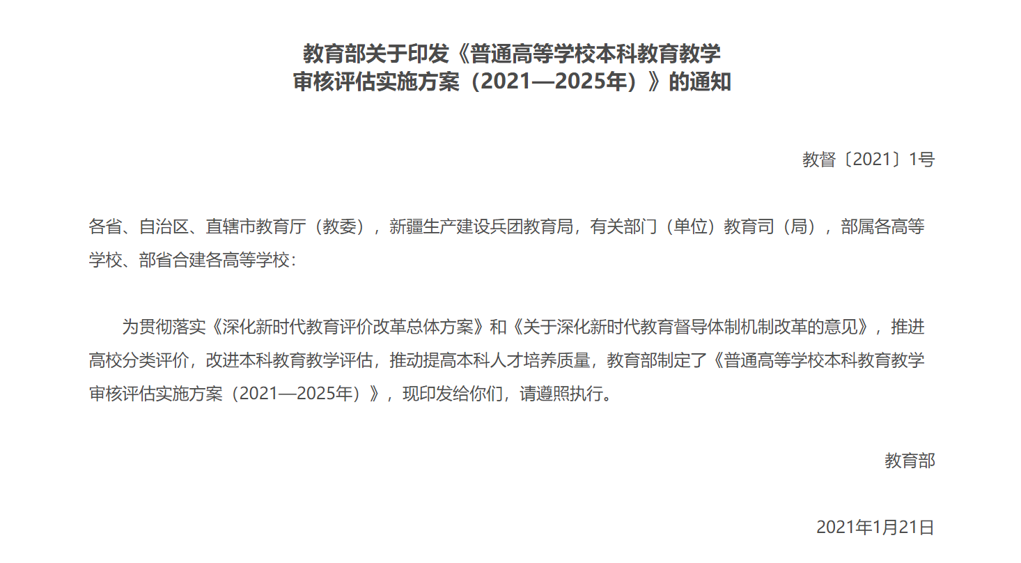 2021年2月,教育部印发《普通高等学校本科教育教学审核评估实施方案(2021-2025年)》(以下简称《方案》),对“十四五”新发展阶段普通高等学校本科教育教学审核评估工作作出整体部署和制度安排。这是继2014-2018年审核评估总体完成后,教育部在教育强国战略背景下启动实施的新一轮审核评估。