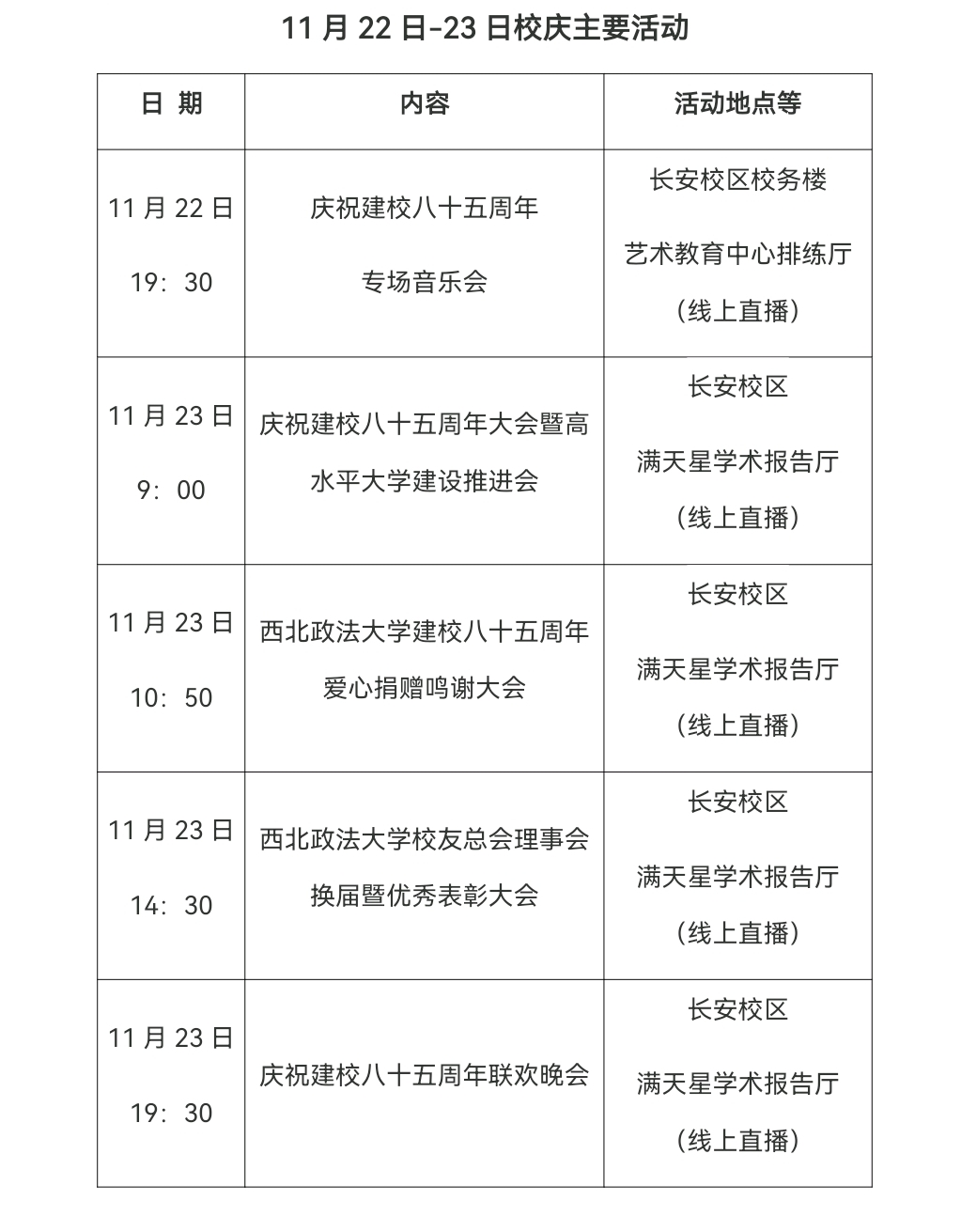 在全校上下深入学习贯彻党的二十大精神之际,学校将于2022年11月23日,围绕“情系西法大,共谱新华章”主题,在长安校区举办“庆祝建校八十五周年大会暨高水平大学建设推进会”“爱心捐赠鸣谢大会”“校友总会理事会换届暨优秀表彰大会”等活动。受疫情影响,各项活动均以线上线下相结合的方式举行,欢迎社会各界和广大校友同步关注活动。