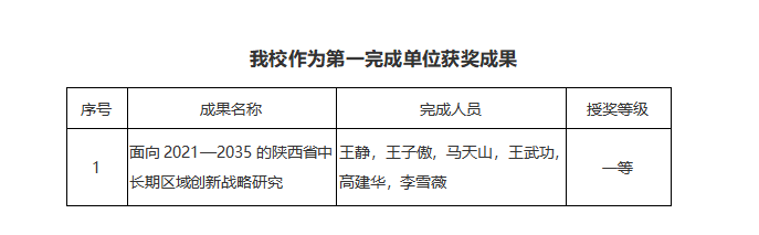 近日,陕西省教育厅印发了《关于公布2024年度陕西高等学校科学技术研究优秀成果名单的通知》,ac米兰商学院王静教授主持完成的科技成果《面向2021—2035的陕西省中长期区域创新战略研究》荣获一等奖。陕西高等学校科学技术研究优秀成果奖是科学技术研究领域重要奖项,ac米兰作为主持单位获一等奖1项,取得了近年来的最好成绩。
