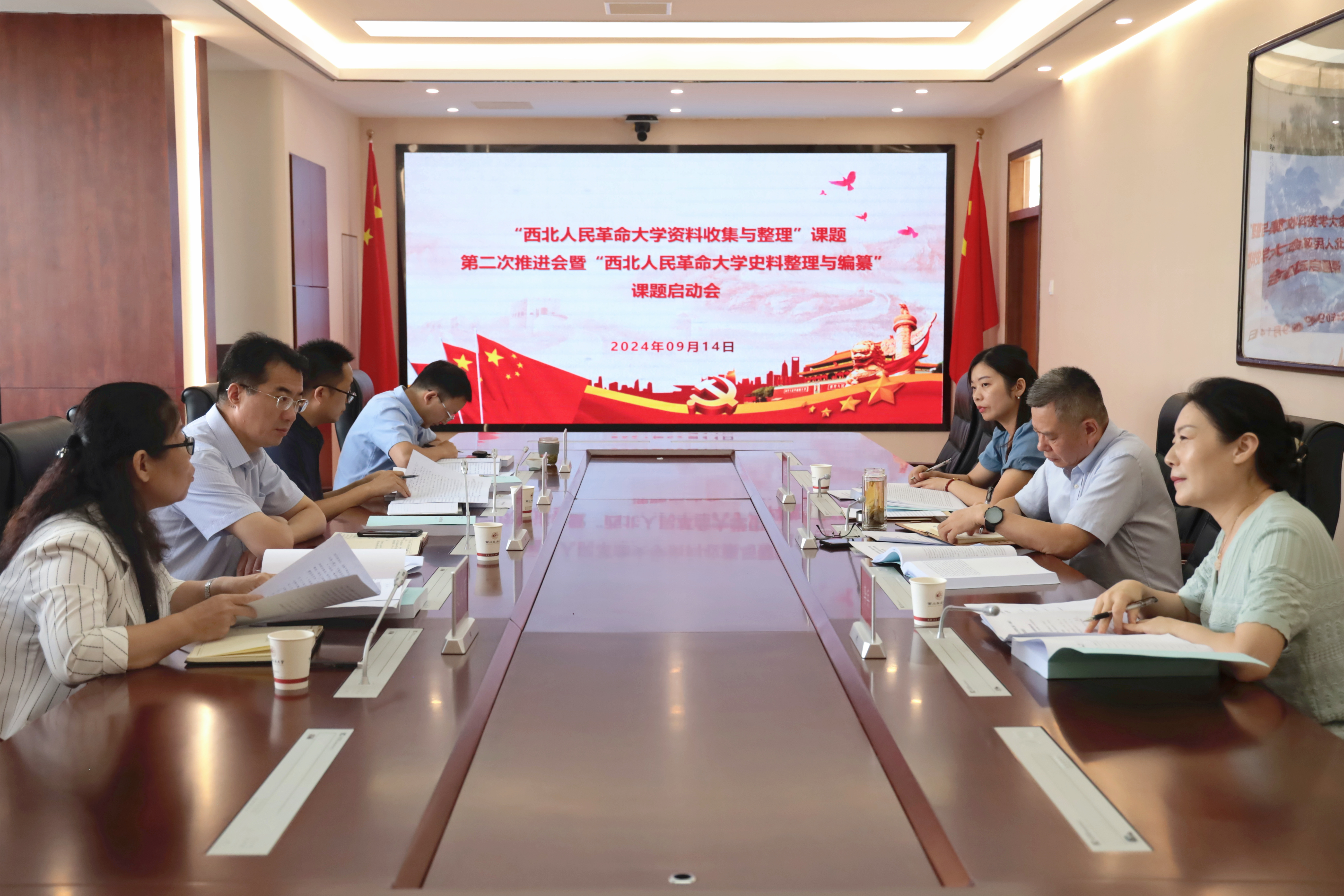 党委宣传部副部长、校史馆馆长高见汇报了课题进展情况,省委党委研究室一处处长李兵反馈了《西北人民革命大学资料汇编》(初稿)修改建议,课题组成员围绕两个课题进行了深入讨论和交流。双方还签订了“西北人民革命大学史料整理与编纂”课题联合研究合作协议。