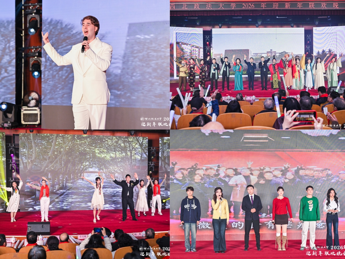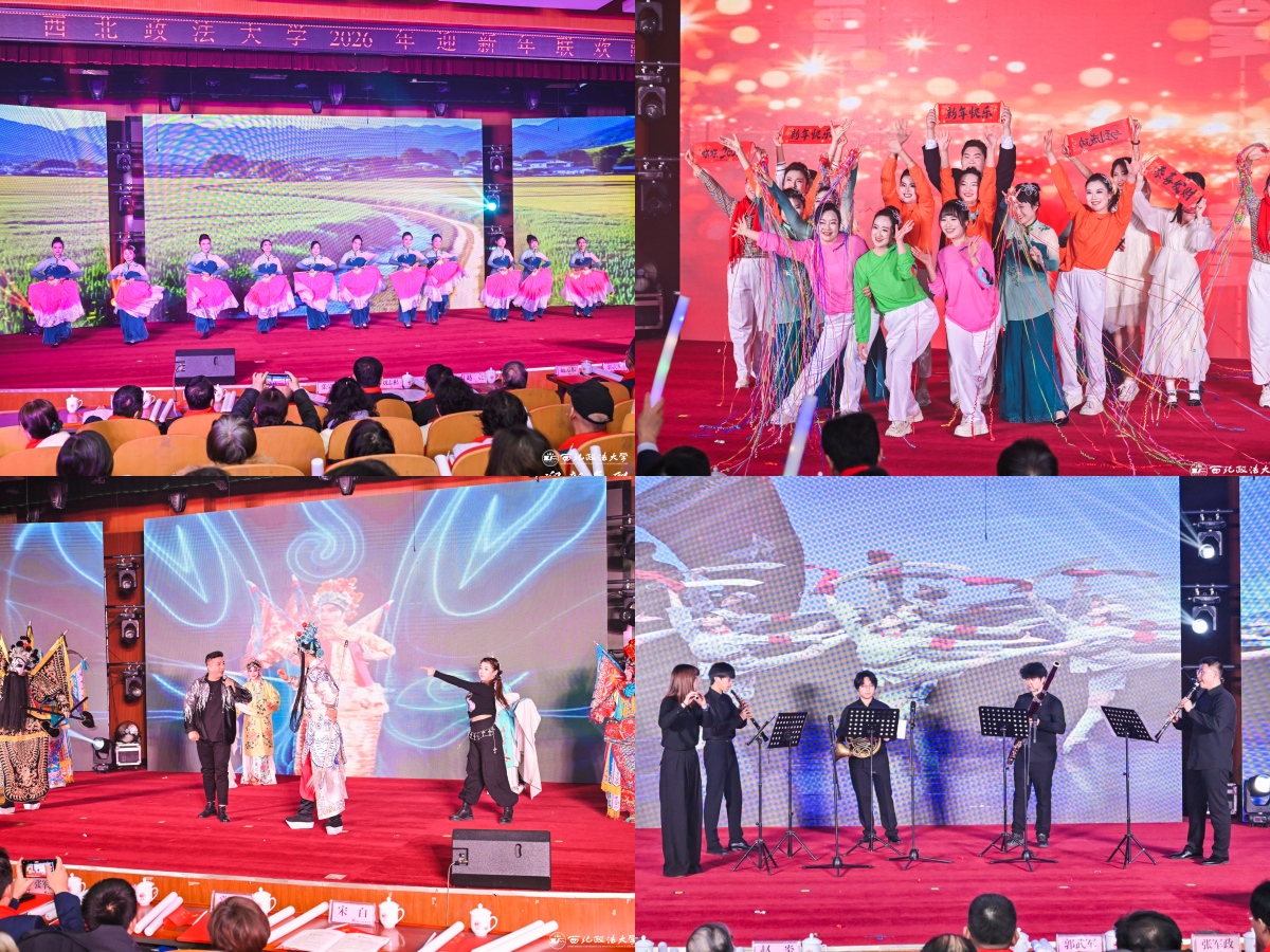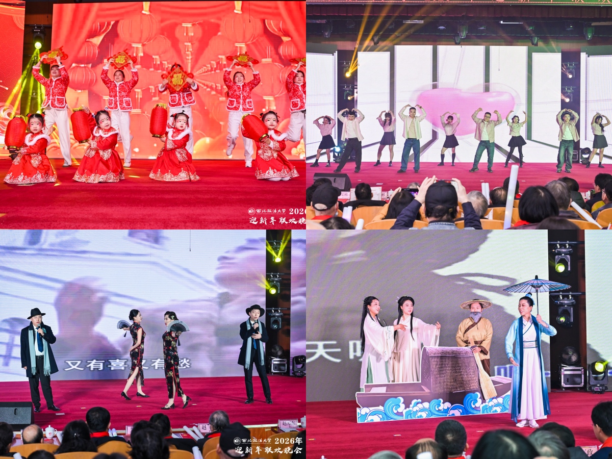 晚会在欢腾热烈的开场舞《欢欢喜喜迎新年》与《青春“员”舞曲》中拉开帷幕,幼儿园小朋友与法治学院 法律硕士教育学院教师联袂演出,以跃动的舞姿、绚丽的灯光瞬间点燃全场气氛。国际法学院(国际仲裁学院)教师化身时光摆渡人,一段《影视老歌“忆”起唱》,带领观众在经典旋律中回味岁月深情;教职工健身操协会表演的《扇舞山河 岁启华章》,以翩跹舞姿演绎国风雅韵,展现文化自信。混声合唱《彩虹》、器乐合奏《快乐的女战士》以及秦腔与摇滚的创新融合,为观众带来一场浸润高雅艺术气息、饱含传统文化底蕴的视听盛宴。