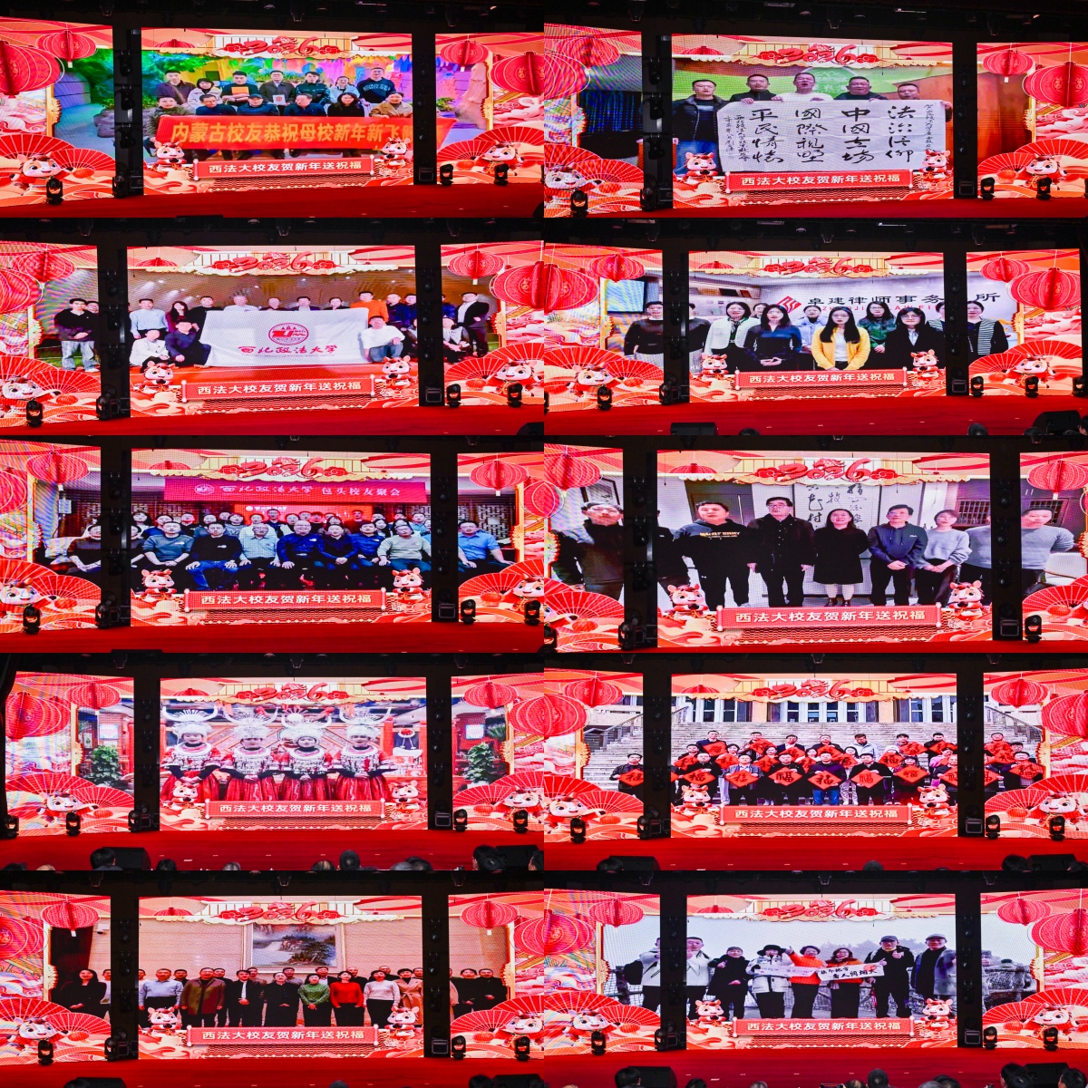 晚会还特设了动人的校友祝福环节,将千里之外的牵挂,汇于咫尺屏幕。不同城市的地标与校友们的笑意在画面中流转,凝成这个冬日夜晚最温暖的集体记忆。无论身处何方,西法大人的心始终与母校同频共振,这份跨越山海的赤子情怀,正是学校发展最深厚的力量源泉。在主持人的邀请下,现场观众中已经荣休的老教师、刚开启学术旅程的青年学子相继起身,纷纷道出感恩与珍重,将岁月的沉淀与初心的炽热,融进简短却厚重的话语里。这发自现场的声浪,与校友们的祝福遥相呼应,共同汇成了学校迈向新征程上的澎湃回响。