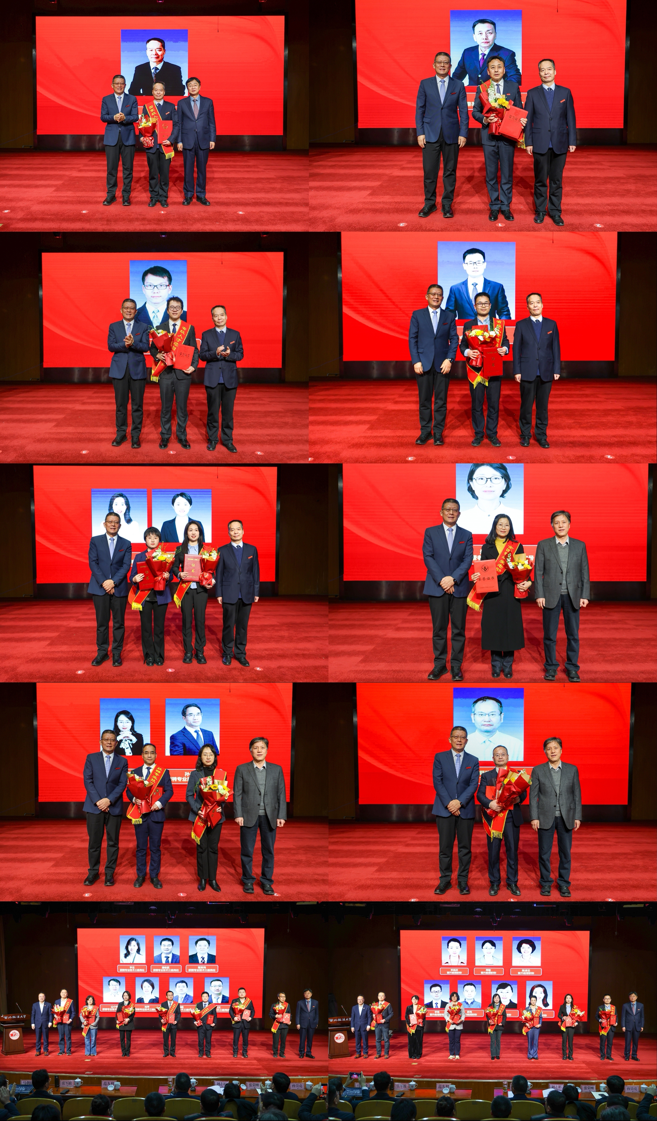 大会举行了隆重的表彰及聘任仪式。赵万东、范九利共同为享受国务院政府特殊津贴专家汪世荣教授颁发荣誉证书并佩戴绶带。赵万东、汪世荣与全国模范教师、校学术委员会副主任刘进田,分别为马朝琦(陕西省三秦英才特支计划哲学社会科学和文化艺术领域领军人才)、刘润泽(陕西省三秦英才引进计划青年项目入选者)、李锋(陕西省中青年科技领军人才)、李丹丹及徐海俊(陕西省青年科技新星)、边晓宏(全国“敬老爱老助老模范人物”称号获得者)、舒洪水(陕西省“十大法治人物”称号获得者)等7位省级以上人才称号及荣誉获得者颁发荣誉证书、佩戴绶带,向2位新聘专业技术二级岗位教师颁发聘书。范九利和陕西省师德标兵、“陕西省黄大年式教师团队”负责人王瀚教授共同为14位新聘专业技术三级岗位教师、教授职称教师颁发聘书。