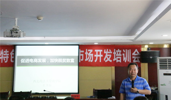 商学院社会实践队的师生们则兵分两路,组成助力山阳县扶贫电子商务暑期社会实践队,开展对特色农产品电子商务发展情况的调查研究。他们走访了十里铺镇、漫川关镇等8个村落,重点访谈对接了山阳万福茶业协会、莲花社区蜂蜜专业户等60户电子商务从业农户,提出了专业性建议,帮其建立后续在线联络支持。电子商务系主任王卫东副教授以特色产品电子商务市场开发培训为主题进行了精彩的授课,受到当地电商专业户、精准脱贫人员的热烈欢迎。