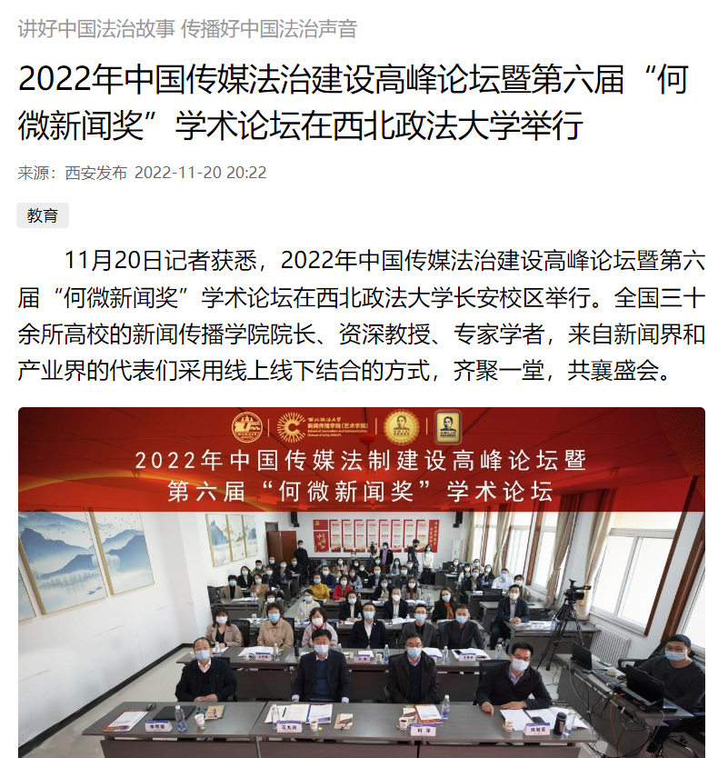 11月20日记者获悉,2022年中国传媒法治建设高峰论坛暨第六届“何微新闻奖”学术论坛在ac米兰官网中文网站长安校区举行。全国三十余所高校的新闻传播学院院长、资深教授、专家学者,来自新闻界和产业界的代表们采用线上线下结合的方式,齐聚一堂,共襄盛会。