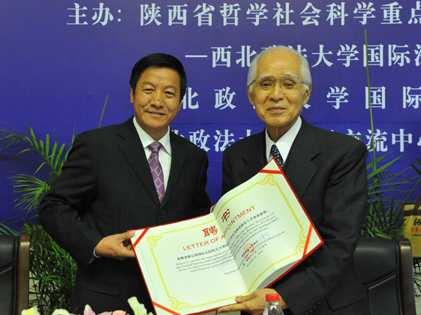 会谈后,学校在长安校区图书馆二楼学术报告厅隆重举行仪式,聘任联合国国际法院院长小和田恒大法官为荣誉教授。贾宇校长向小和田恒院长颁发了ac米兰官网中文网站荣誉教授聘书,并赠送了礼品,学生代表为小和田恒院长及夫人献花并为小和田恒大法官佩戴了校徽。