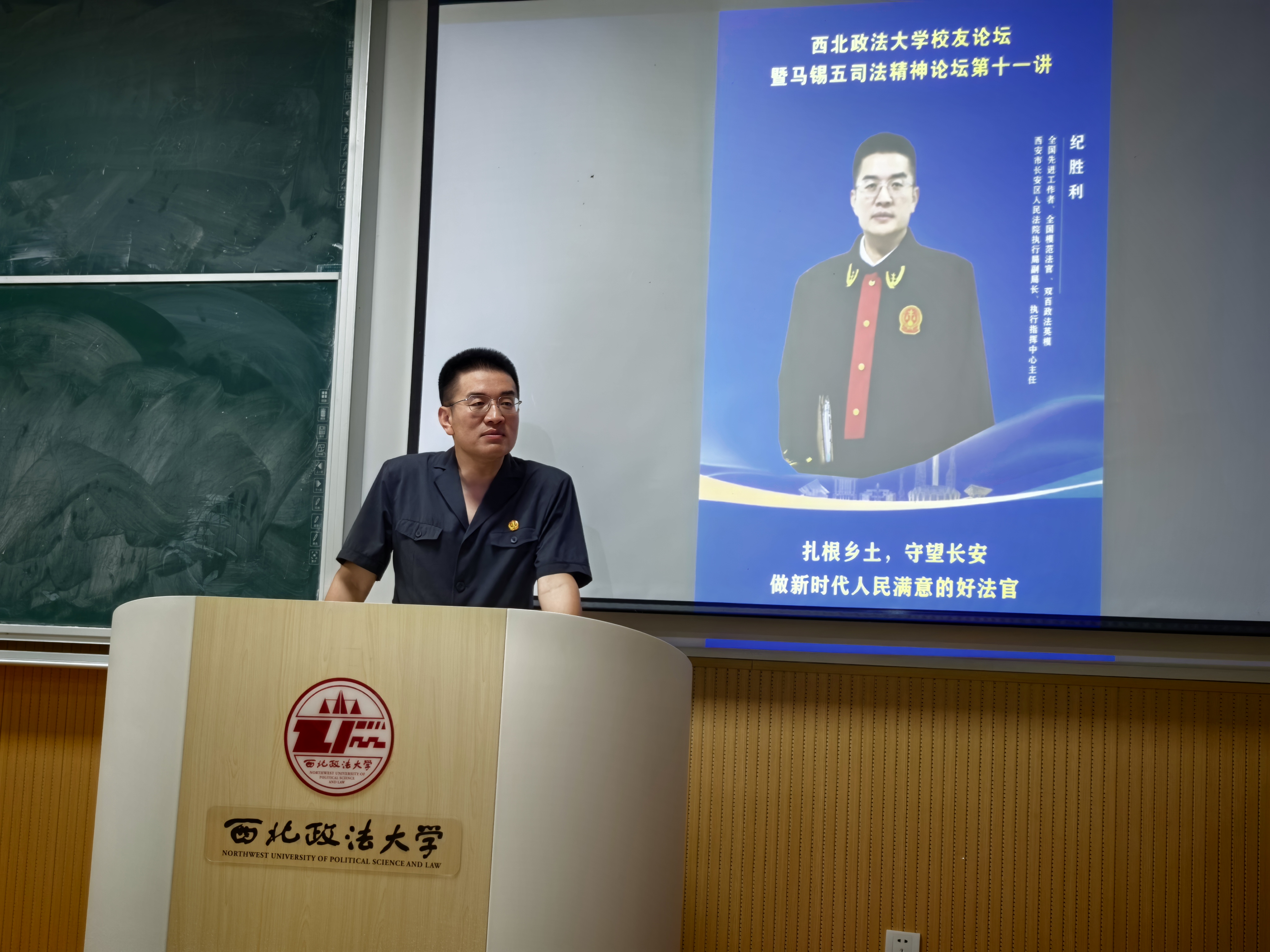 5月21日晚,由ac米兰国内合作与校友工作处、马锡五审判方式研究院联合主办的“ac米兰官网中文网站校友论坛暨马锡五司法精神论坛”在长安校区天平楼AJ31教室举行。全国先进工作者、“双百政法英模”、全国模范法官、全国优秀法官、ac米兰1997级校友、西安市长安区人民法院执行局副局长兼执行指挥中心主任纪胜利法官受邀作题为《扎根乡土、守望长安,做新时代人民满意的好法官》的专题讲座。副校长赵全宇在会前会见了纪胜利,国内合作与校友工作处处长刘霖杰主持会议。人权研究中心执行主任、马锡五审判方式研究院院长马成教授担任与谈人,学校120余名师生参加。