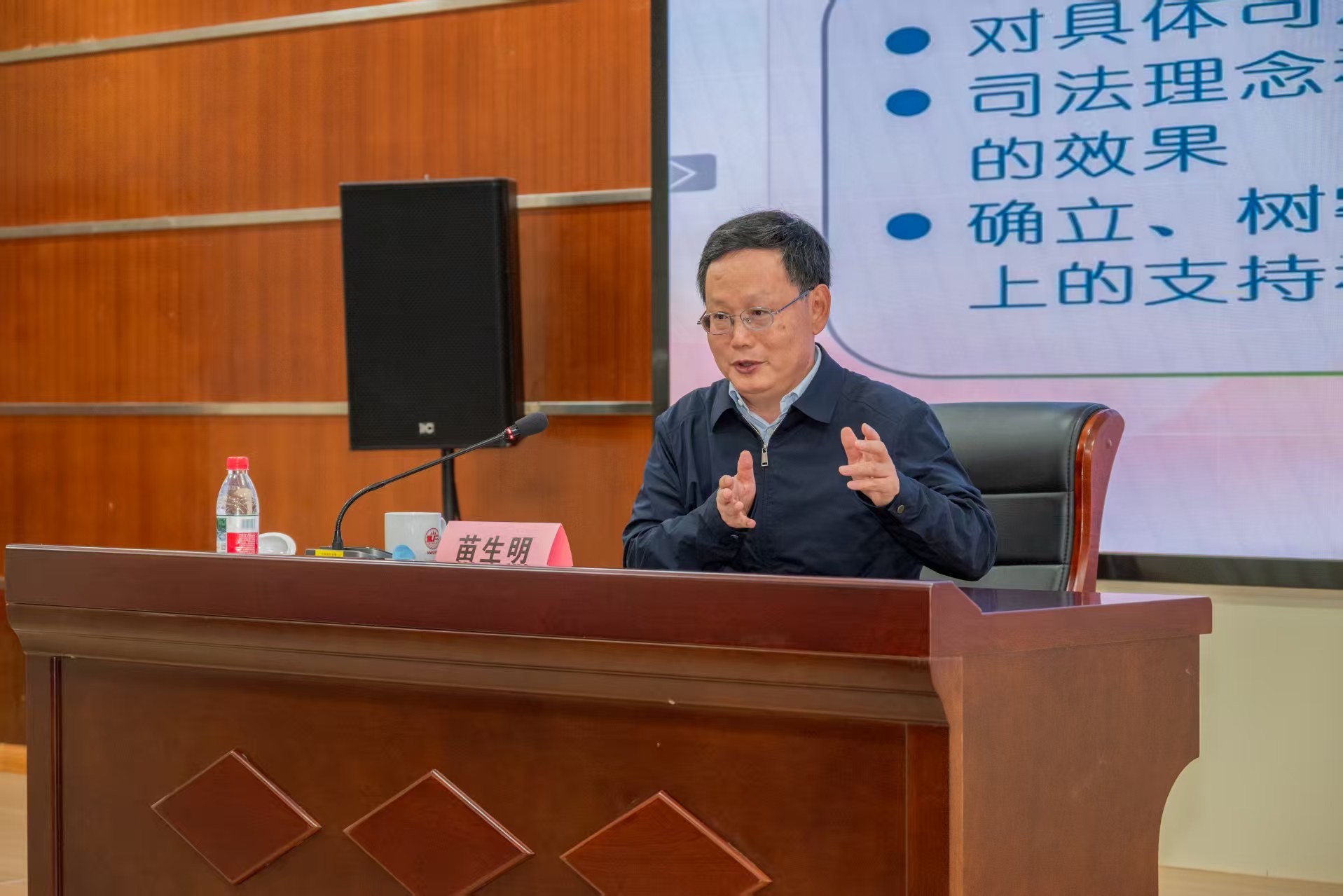 苗生明兼具深厚理论功底与丰富实务经验,在授课中紧密结合当前国内外政治经济发展变化背景,聚焦刑事案件频发带来的刑法理论与司法实践新课题,围绕《刑事司法基本理念问题》主题展开系统阐释。他以典型司法案例为切入点,将抽象的刑事司法理念转化为具体实践指引,深入浅出解析刑事司法在事实认定、证据审查、法律适用等关键环节的核心要点,为在场师生搭建起从法学理论走向司法实务的桥梁。