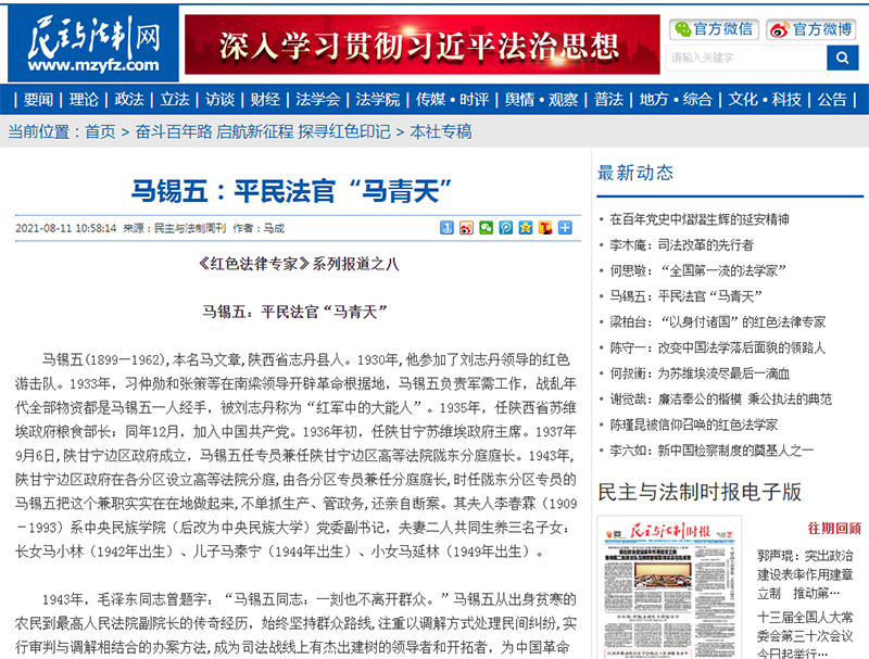 1943年,毛泽东同志曾题字:“马锡五同志:一刻也不离开群众。”马锡五从出身贫寒的农民到最高人民法院副院长的传奇经历,始终坚持群众路线,注重以调解方式处理民间纠纷,实行审判与调解相结合的办案方法,成为司法战线上有杰出建树的领导者和开拓者,为中国革命和党的群众路线、司法路线建立发展作出了卓越的贡献。他在办案中的许多做法,已经成为人民司法事业最可宝贵的优良传统和精神财富,深受广大群众欢迎,人们亲切地称他为“马青天”。