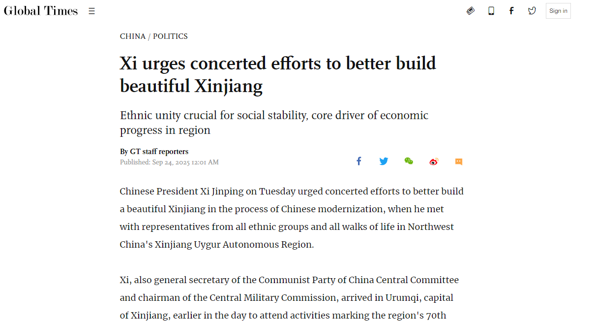 9月24—25日,舒洪水在接受《环球时报》英文版记者采访中表示,习近平主席出席新疆维吾尔自治区成立70周年庆祝活动,强调了新疆发展在国家高质量发展战略布局中的科学定位。新时代党的治疆方略是从战略高度和长远角度进行设计并完善,已经形成了一套系统全面、逻辑严密的理论体系。