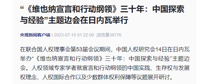 在联合国人权理事会第53届会议期间,中国人权研究会14日在日内瓦举办“《维也纳宣言和行动纲领》三十年:中国探索与经验”主题边会。人权领域专家学者就宣言和行动纲领的中国实践、生存权与发展权理念、人权国际合作以及少数群体权利保障等议题展开研讨。