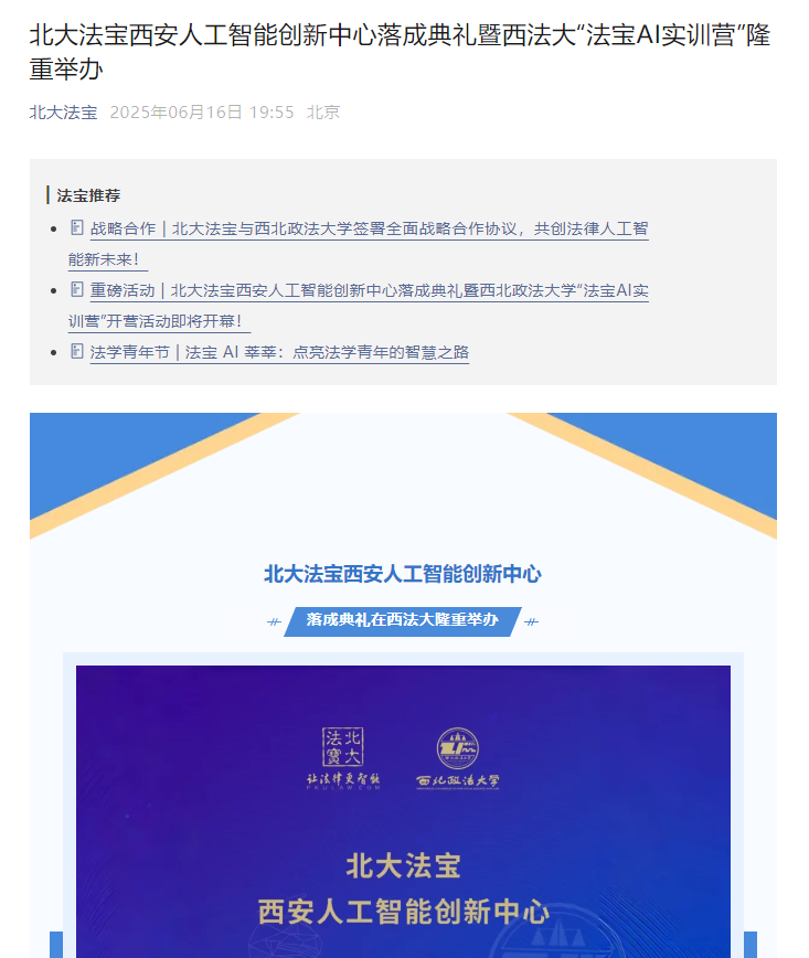 【北大法宝】北大法宝西安人工智能创新中心落成典礼暨西法大“法宝AI实训营”隆重举办 https://mp.weixin.qq.com/s/OMqisgqYlqrwzYSdQLmTEA