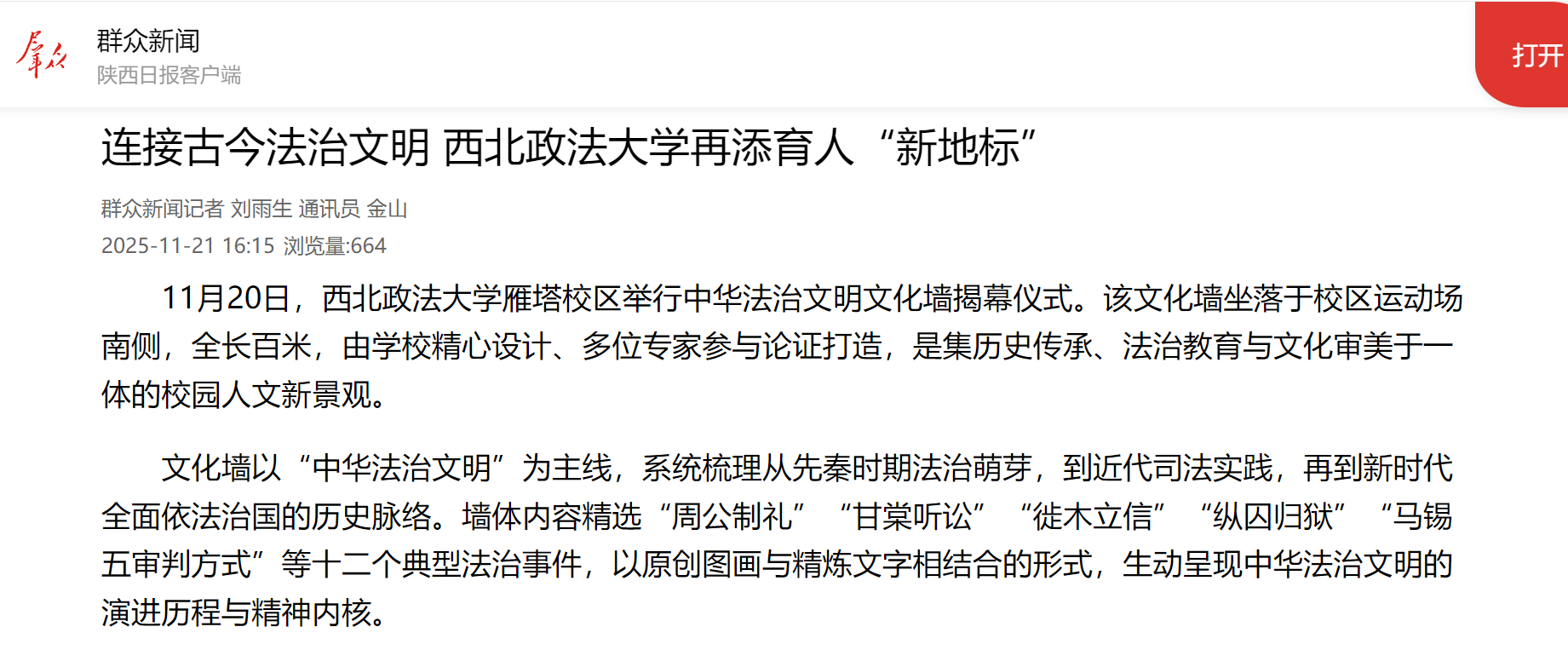 据悉,该文化墙不仅注重内容的历史厚重感与专业性,也在环境营造上融入巧思。墙下搭配绿植与花卉,使法治故事与自然景致相映成趣,在庄重中增添灵动,成为校园中一道兼具教育功能与观赏价值的文化风景,让师生在日常中潜移默化地接受法治文化熏陶。