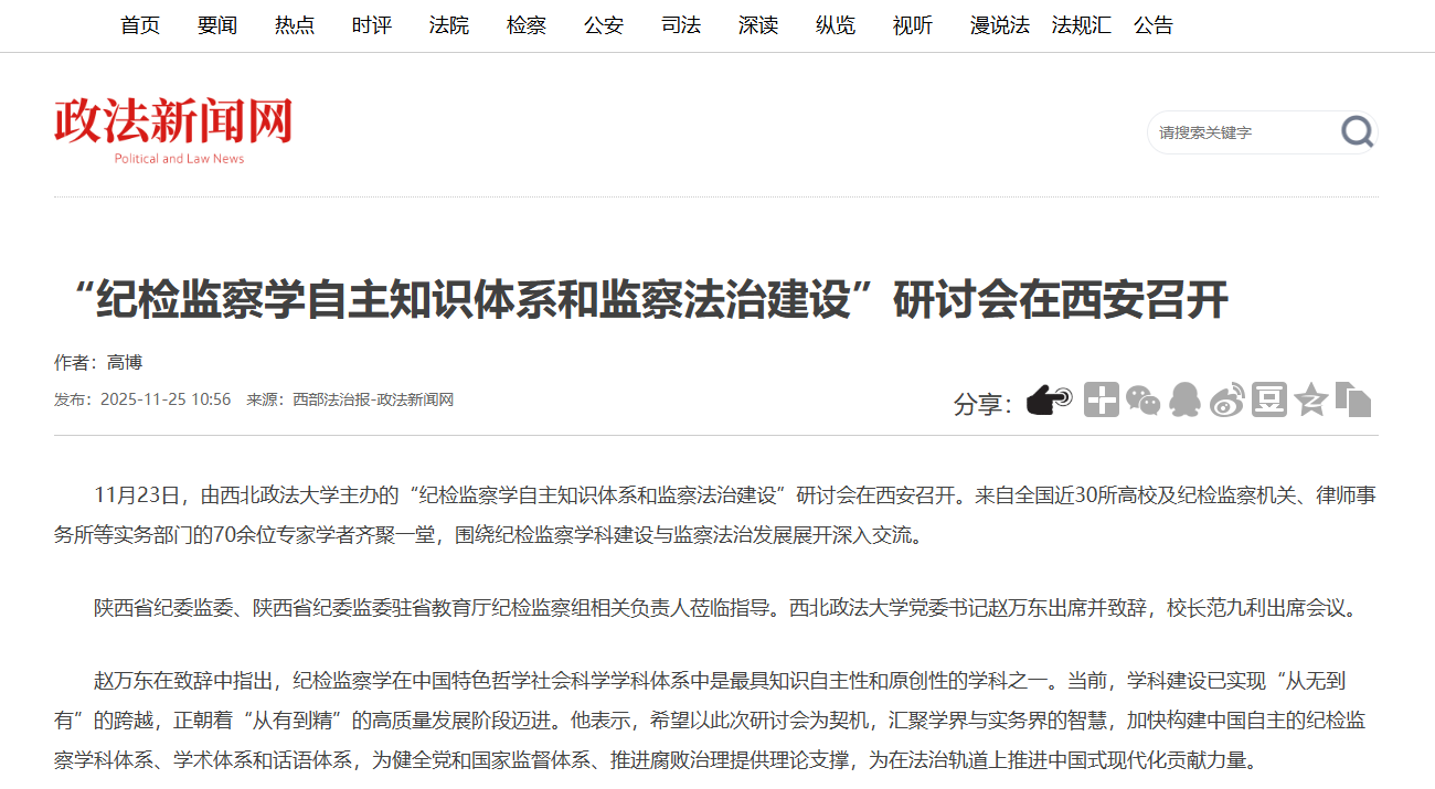 【政法新闻网】“纪检监察学自主知识体系和监察法治建设”研讨会在西安召开 https://www.xbfzb.com/2025-11/25/content_11424278.html
