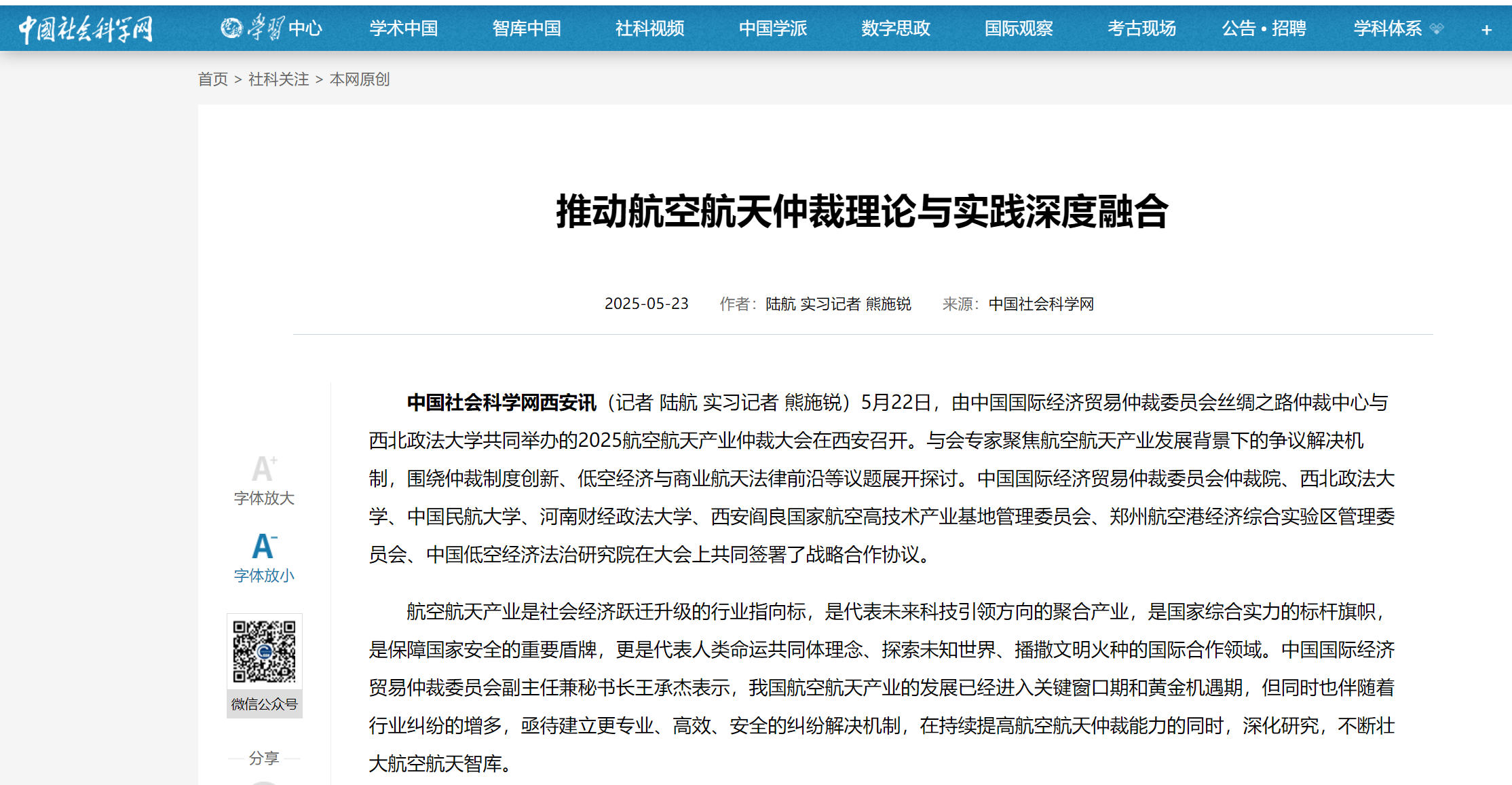 【中国社会科学网】推动航空航天仲裁理论与实践深度融合 https://www.cssn.cn/skgz/bwyc/202505/t20250523_5875395.shtml