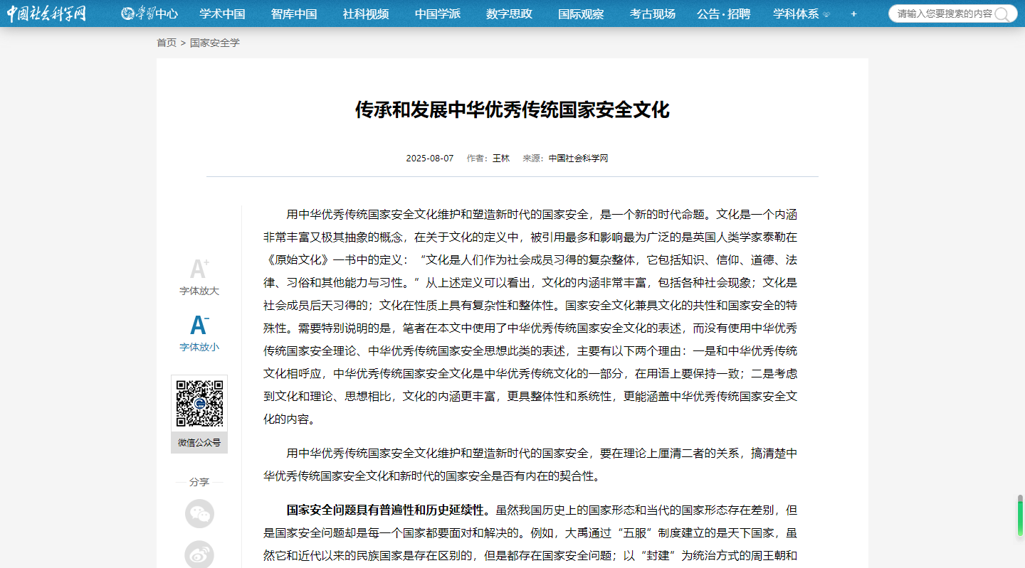 【中国社会科学网】王林:传承和发展中华优秀传统国家安全文化https://www.cssn.cn/gjaqx/202508/t20250807_5909742.shtml