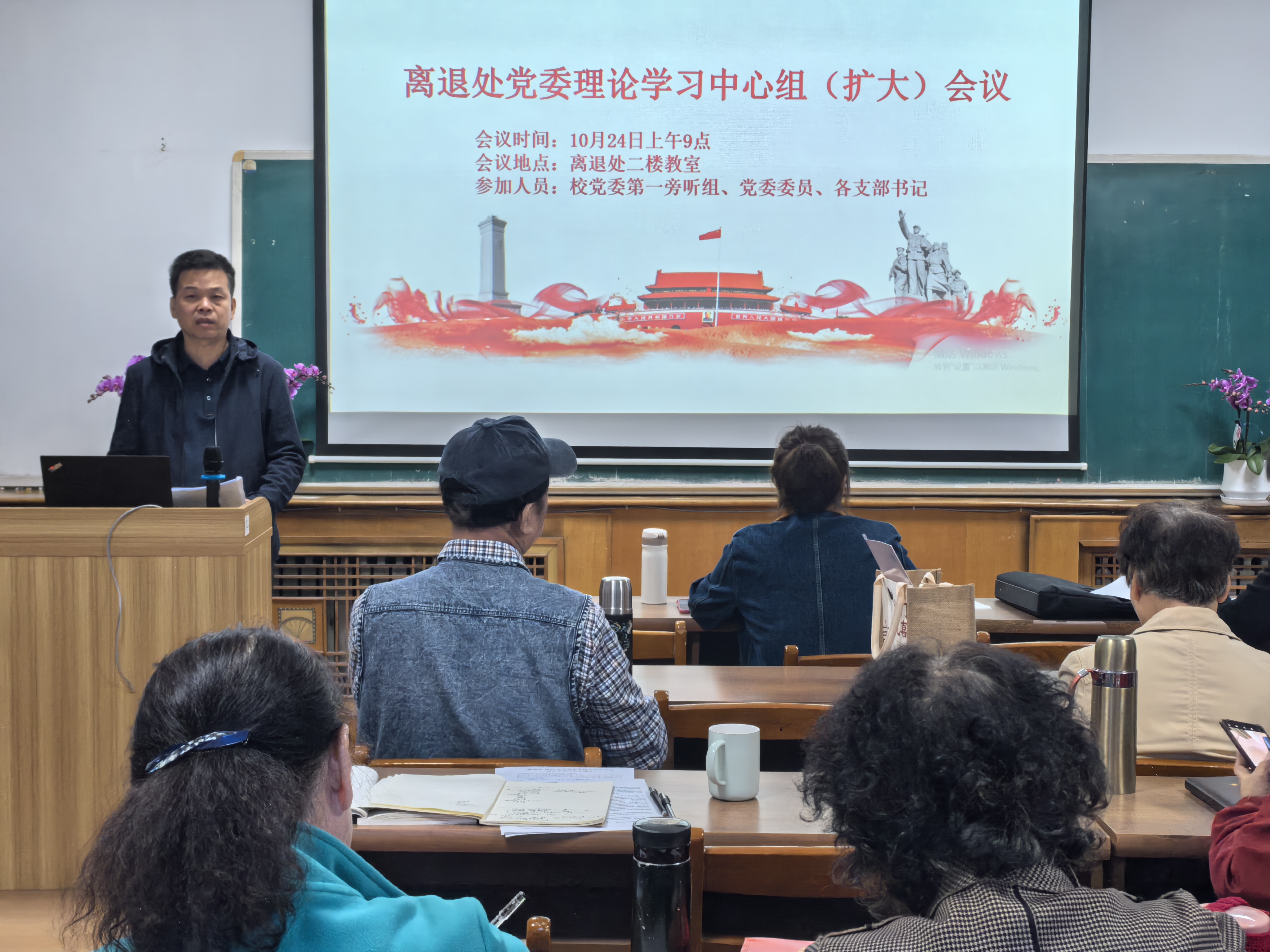 10月24日上午,离退处党委在雁塔校区离退休活动中心召开理论学习中心组(扩大)会议,学习贯彻党的二十届三中全会精神。校党委委员、统战部部长、理论学习中心组第一旁听组组长桑元峰列席旁听,离退处党委委员、各党支部书记参加会议。处党委书记陈永康主持。