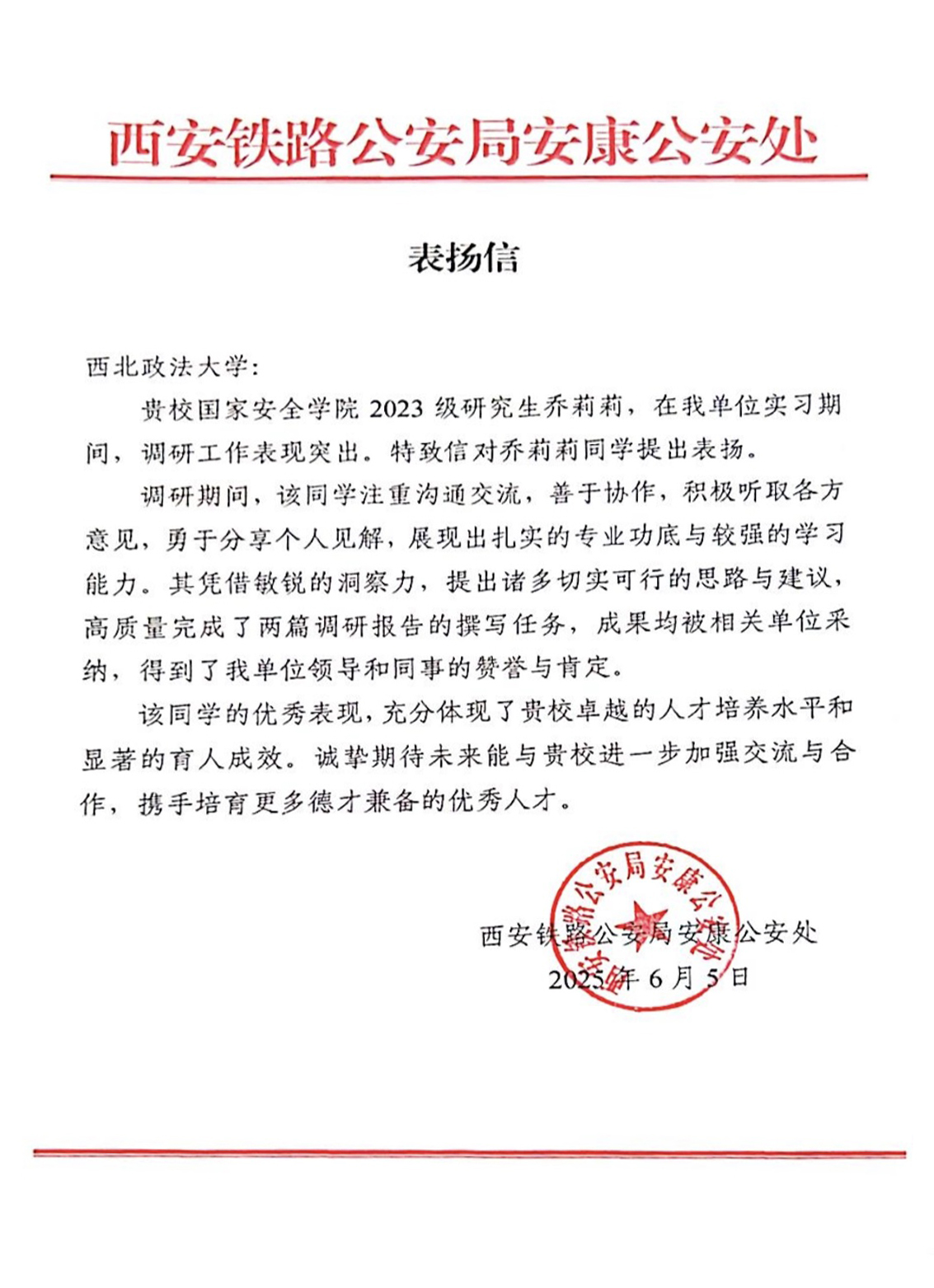 近日,ac米兰国家安全学院(反恐怖主义法学院)收到西安铁路公安局安康公安处发来的表扬信。该单位在信中对国家安全学院(反恐怖主义法学院)2023级研究生乔莉莉同学实习期间的优秀表现给予了高度赞扬,同时对学院人才培养工作表示了诚挚感谢。