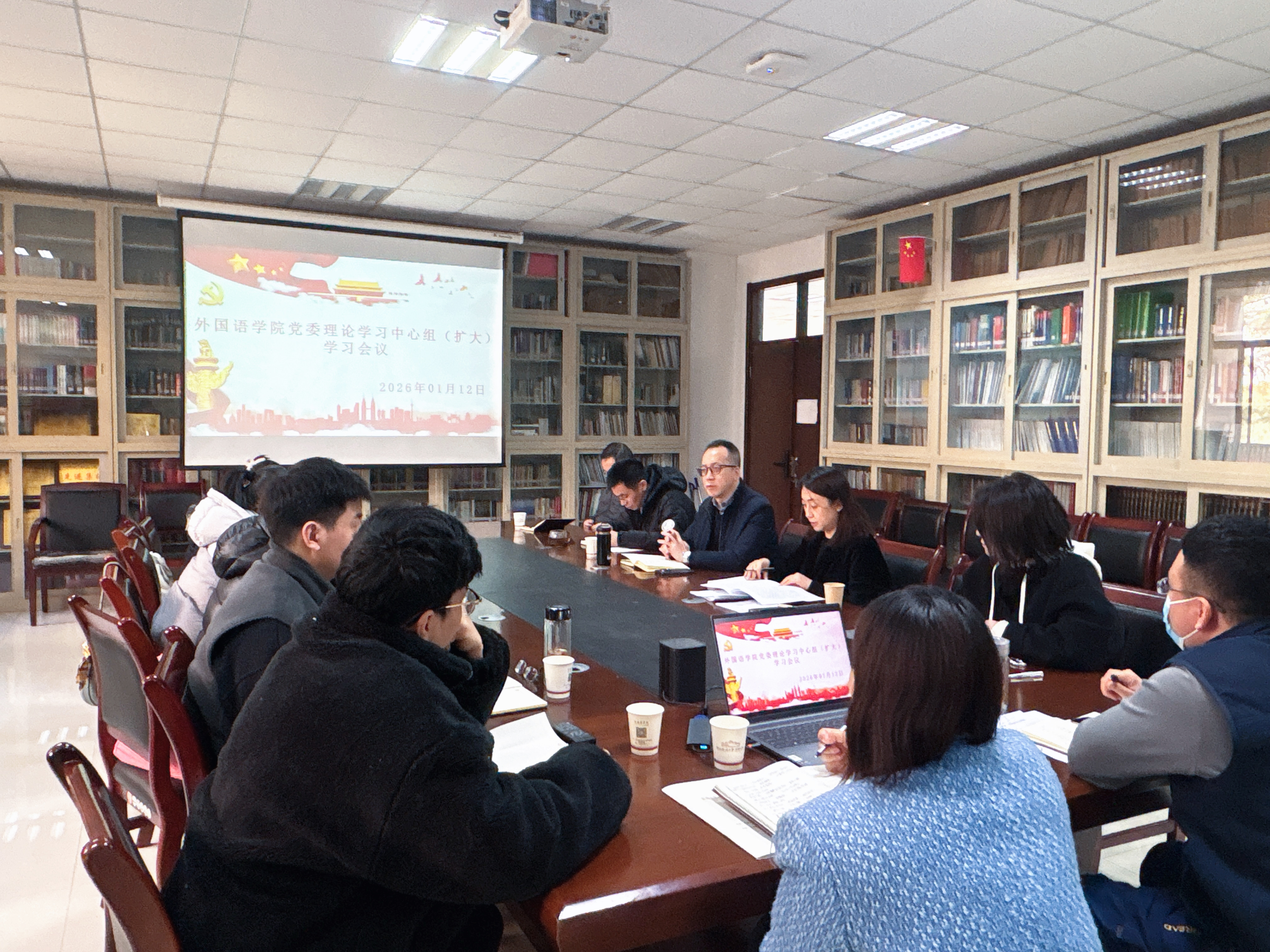 1月12日,外国语学院党委召开理论学习中心组(扩大)学习会议。学院领导班子成员、党委委员、各党支部书记及科级干部参加会议,会议由学院党委书记陈梦琦主持。